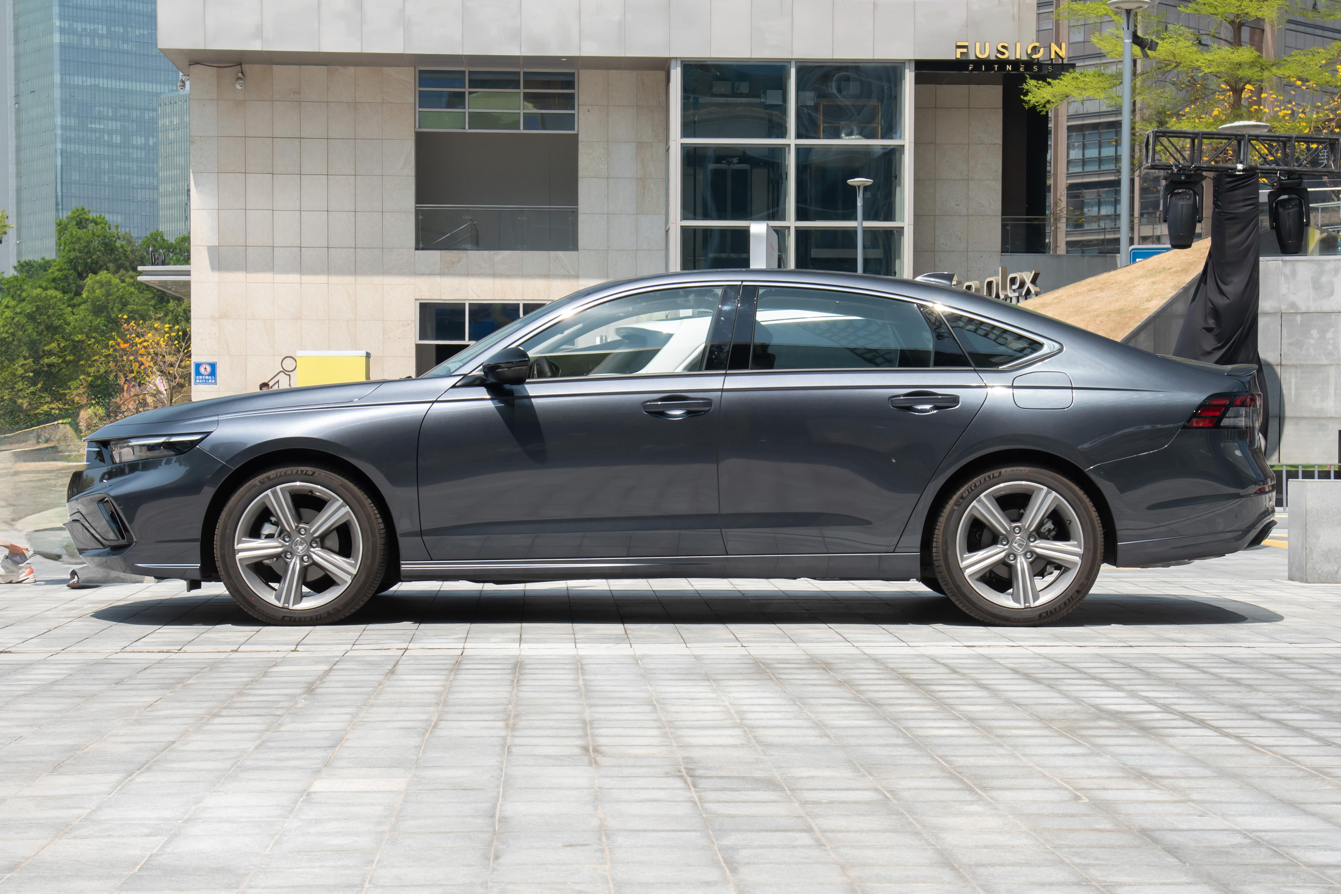 雅阁延续本田家族式设计,车身尺寸为4990×1862×1449mm,轴距2830mm。前脸采用六边形熏黑进气格栅,内部蜂窝状纹理与“刃锋式”横向镀铬饰条形成视觉张力,搭配细长的LED日行灯带与矩阵式主灯组,攻击性十足。车身侧面线条简洁利落,从车头延伸至车尾的流畅线条赋予整车力量感,18英寸双色切割轮毂(轮胎规格235/45 R18),兼顾运动与舒适性。尾部采用贯穿式尾灯设计,简约时尚,与前脸风格呼应,点亮后线条流畅、层次分明,夜间行驶时辨识度极高。星空蓝车漆通过三层喷涂工艺实现金属颗粒的立体分布,在特定角度下可呈现银河般的光影效果。