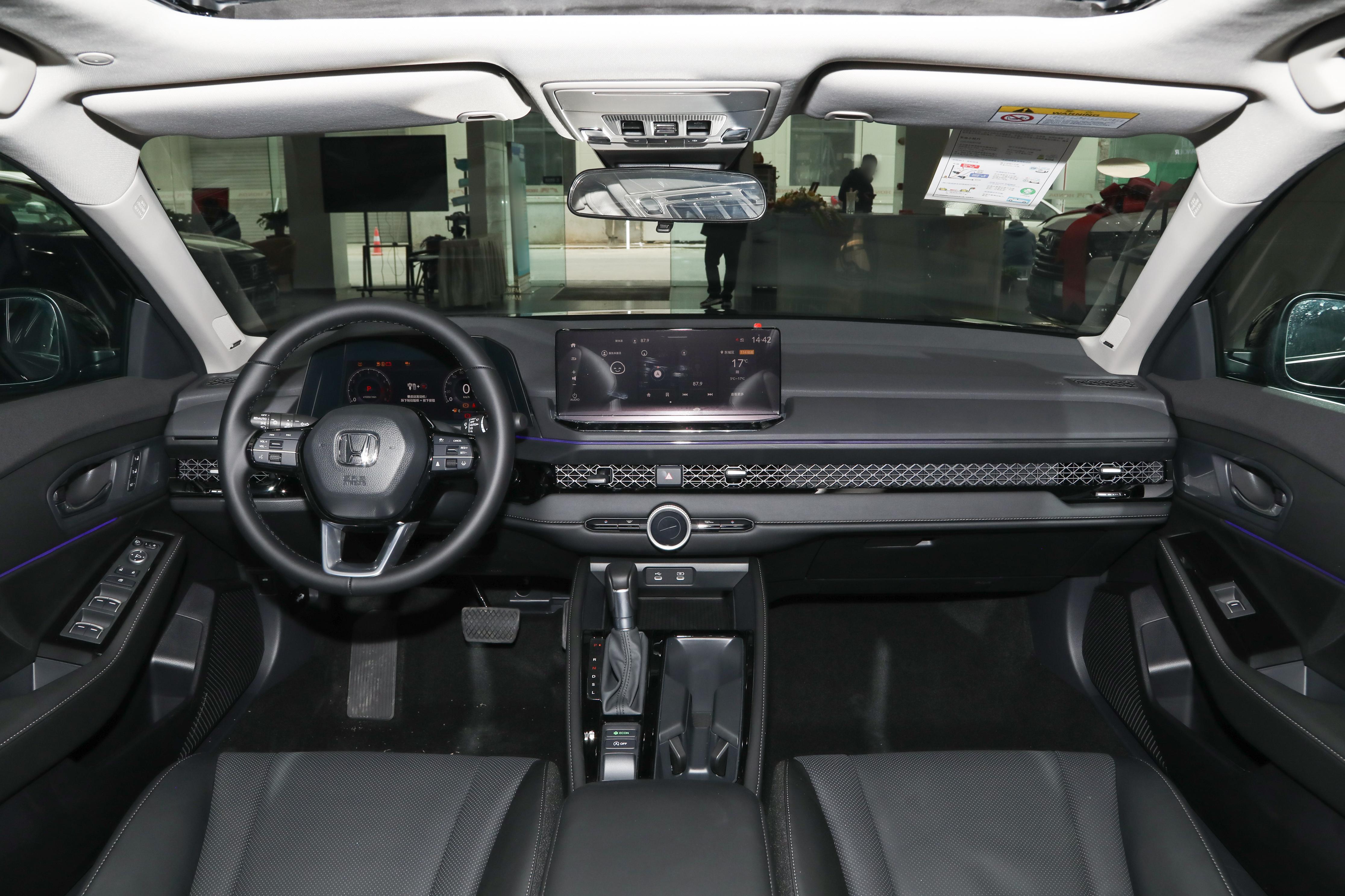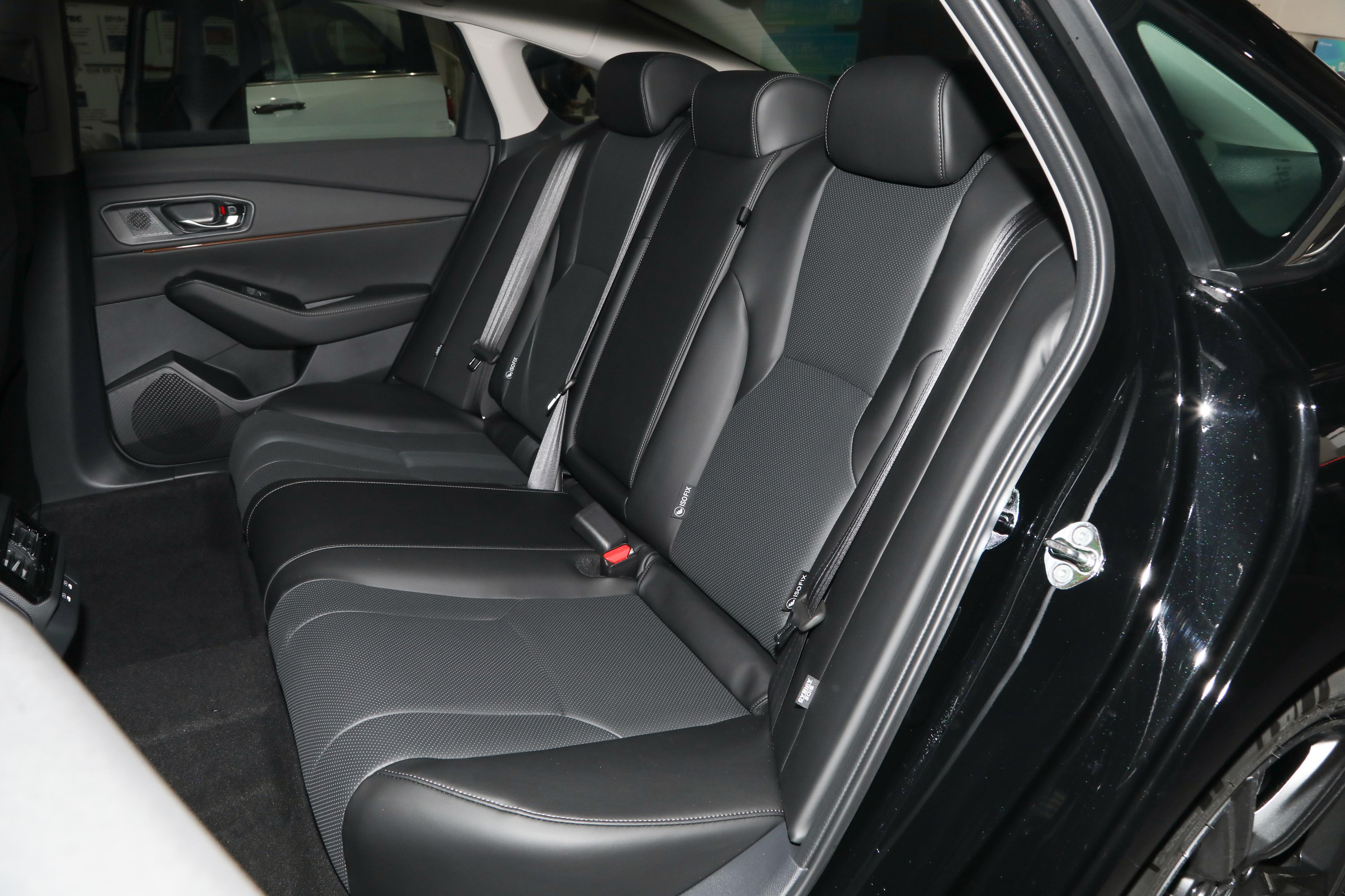 雅阁则采用“极简主义”设计语言,中控台以10.2英寸全液晶仪表与12.3英寸悬浮式中控屏为核心,取消传统物理按键,通过触控与语音控制实现操作“零负担”。内饰材质以“原木纹饰板+哑光金属”为主,搭配环保回收材料制成的“微纤维超纤皮”座椅,触感媲美真皮但减重30%。车门内饰板融入3D立体编织工艺,纹理灵感源自“中国结”的交错结构,将传统文化以现代工业语言重构。座椅采用仿皮材质,主驾支持8向电动调节与腰部支撑,前排座椅具备加热与通风功能,后排座椅靠背角度支持27°调节,长途乘坐舒适性提升。雅阁轴距为2830mm,通过优化车内布局,身高177cm的乘客后排腿部空间仍可达2拳半(约25cm),地台中央凸起高度约15cm,中间乘客舒适性略受影响。后备箱容积未明确标注,但内部规整,可竖直放置28寸行李箱+2个20寸登机箱;后排座椅支持4/6比例放倒,扩展后纵深可达1.9米,适配滑雪板或露营装备。