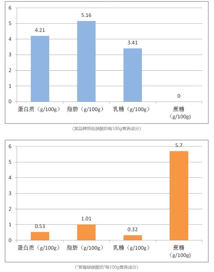 也就是说,每100g产品中,预包装酸奶蛋白质含量是书亦烧仙草样品的7.9倍,脂肪含量为5倍,乳糖含量为10倍。