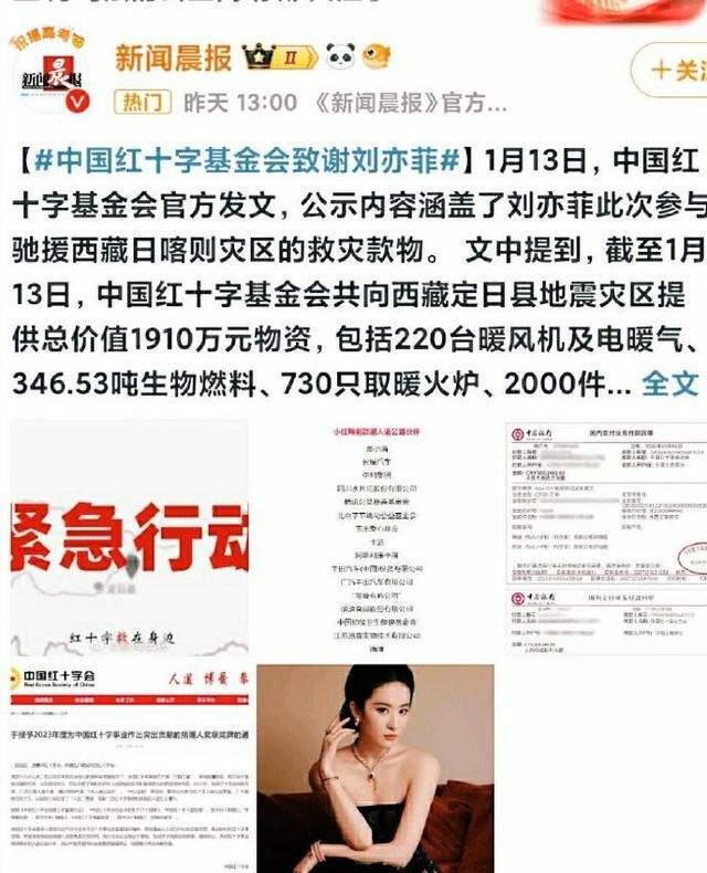 1月13日新闻晨报提及了刘亦菲与他人为灾区民众捐赠了共730只取货暖炉。