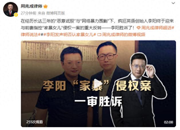 据九派新闻微博,9月28日,@周兆成律师 发文称:经过三年“恶意诋毁”与“网络暴力围剿”下,疯狂英语创始人李阳诉前妻名誉