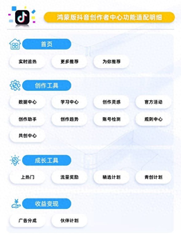 因为我平时鸿蒙版抖音用得比较多所以先说说它。以前总觉得在鸿蒙版抖音刷视频很爽,但一到后台创作,就感觉差点意思。现在,更新后的鸿蒙版抖音创作者中心就是个全能管家,把“创作”、“成长”、“变现”三大难题安排得明明白白。