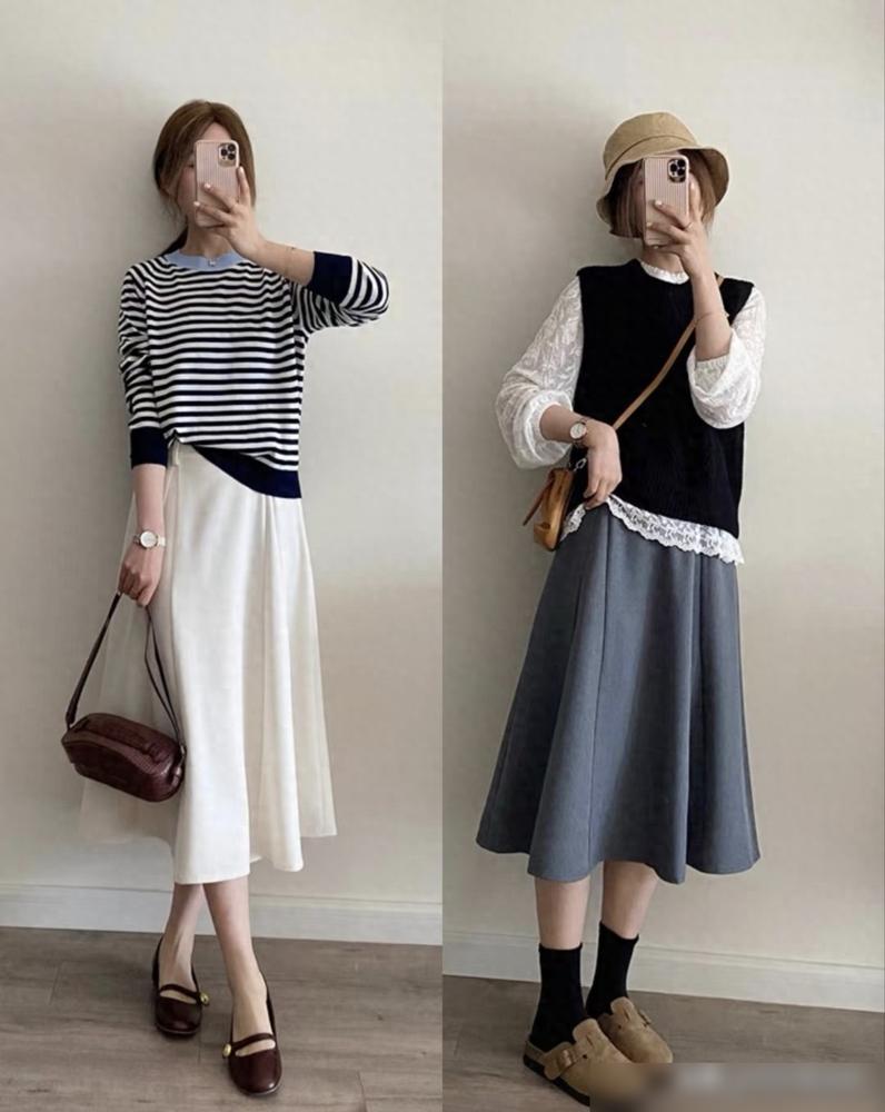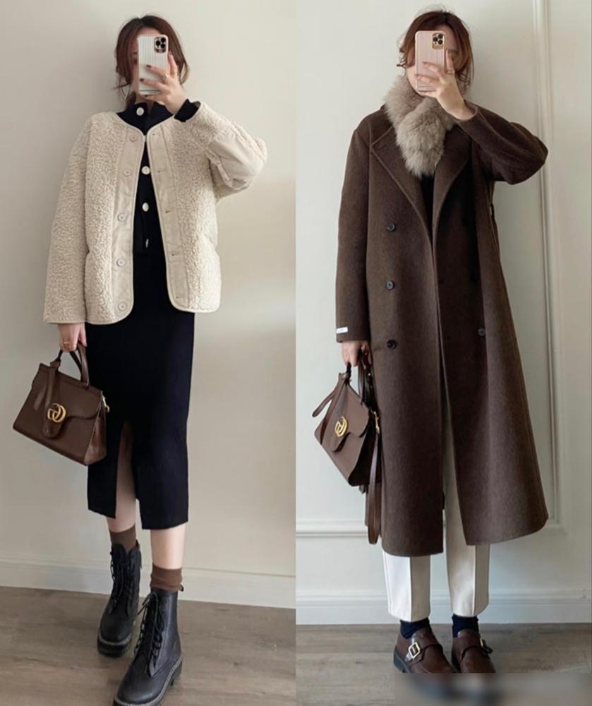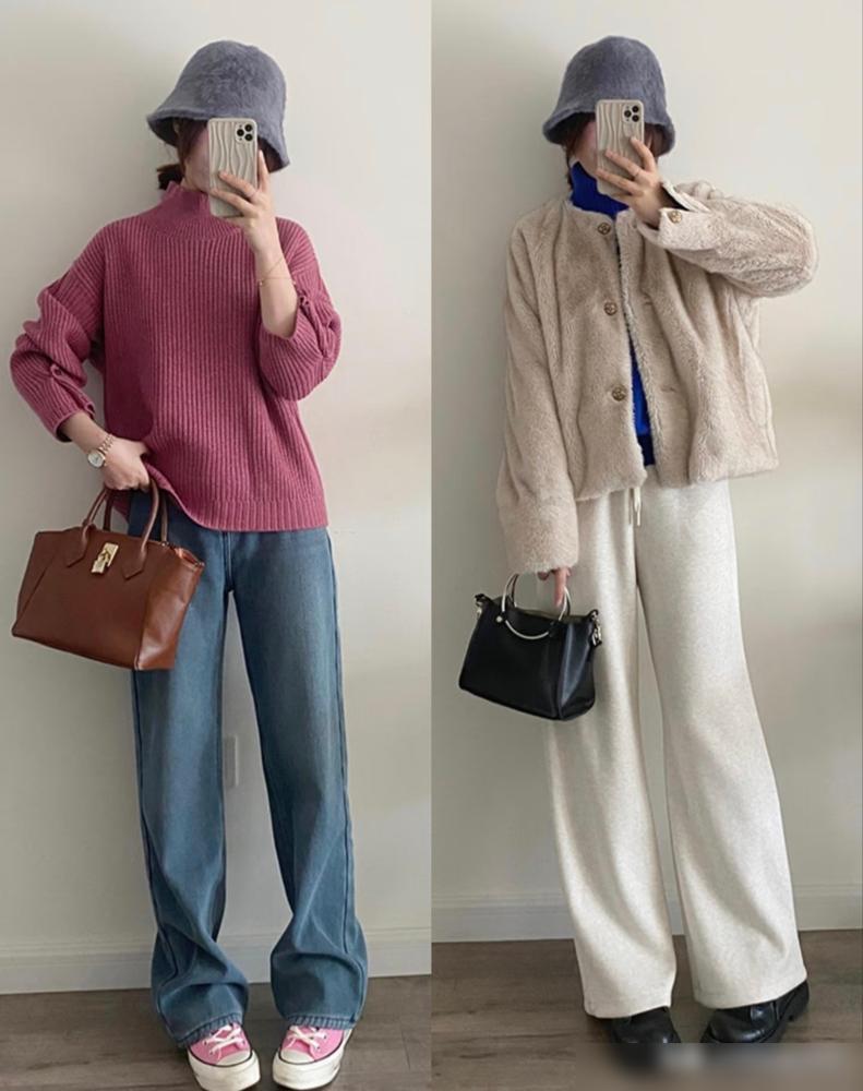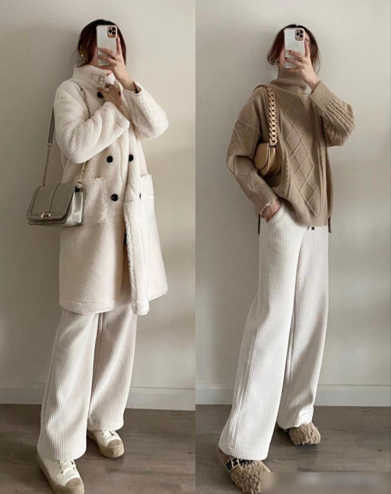 颜色搭配以柔和为主。米白、浅灰、淡粉这些颜色不挑人。同色系穿搭高级感满满。