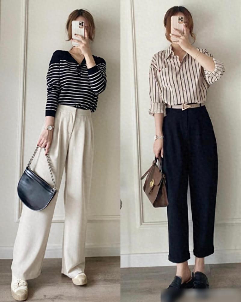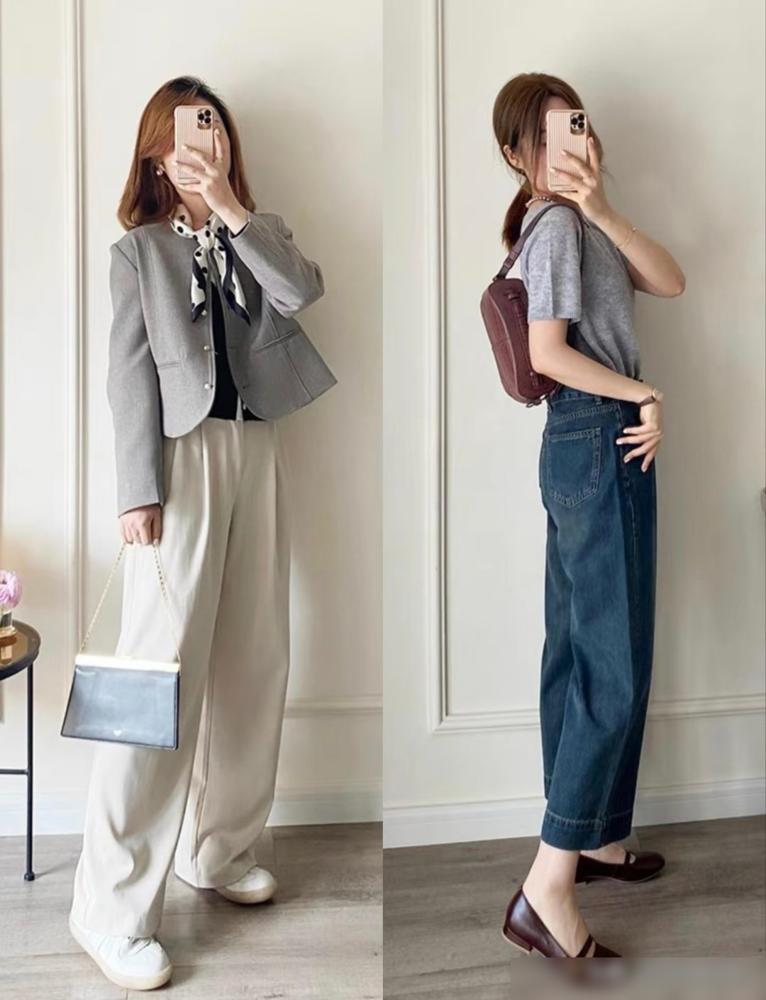 通勤装选垂感好的面料。西装裤配针织衫,干练又温柔。颜色选低饱和度,看起来更清爽。