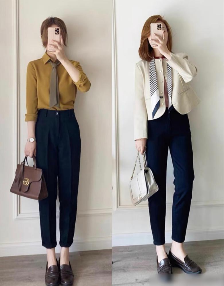 ✨配饰不用多。一条丝巾或项链,提升精致感。鞋子选浅口单鞋,视觉上延长脚背线条。