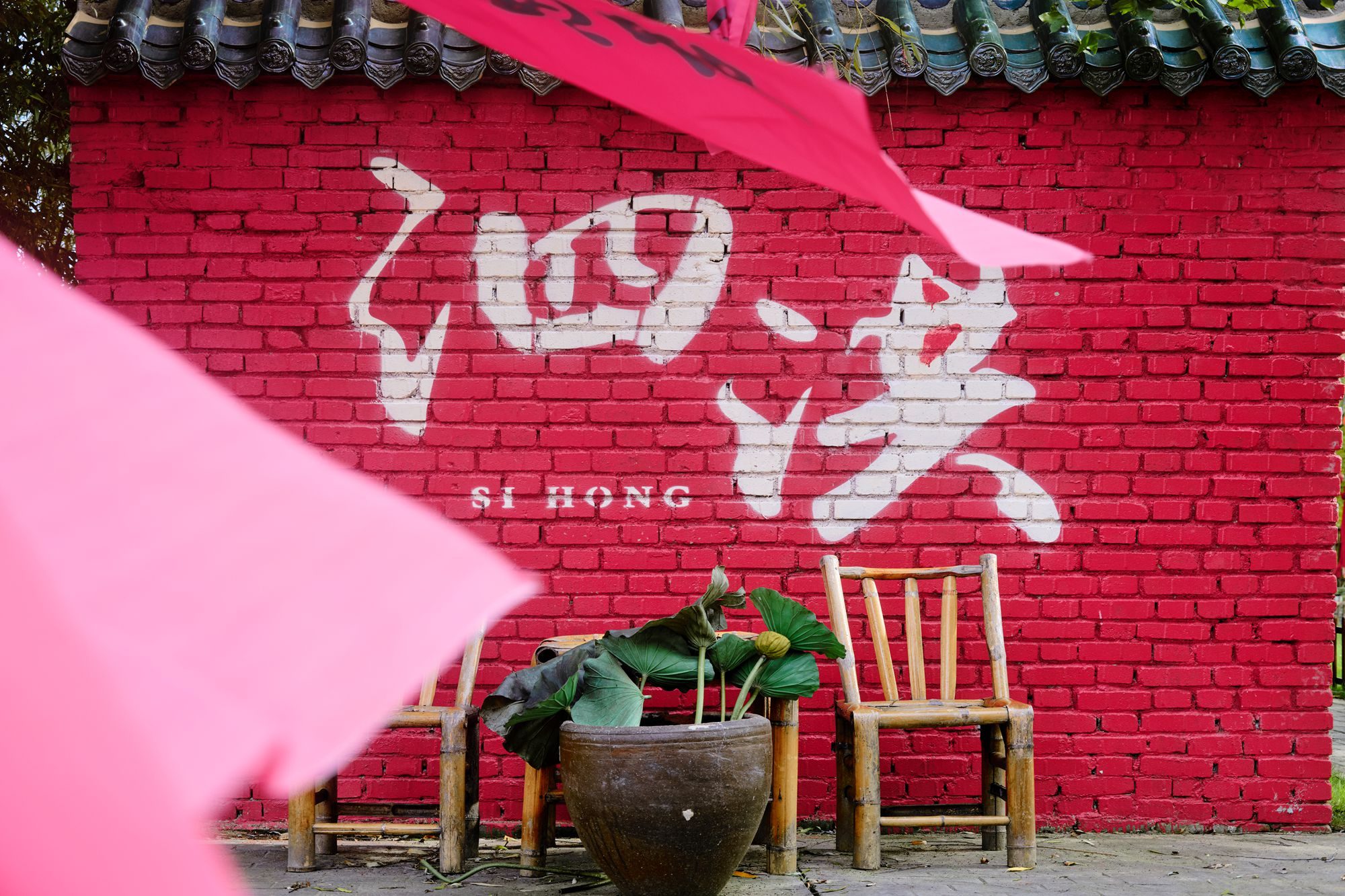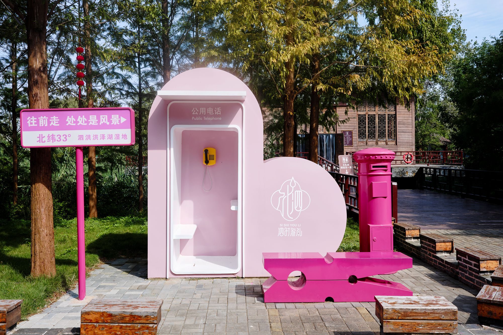 此时的湿地静美而绚烂,鲜红的砖墙遥遥呼应着水杉和红枫的色彩,红砖墙下摆放着竹桌椅和荷叶,田园气息十足。