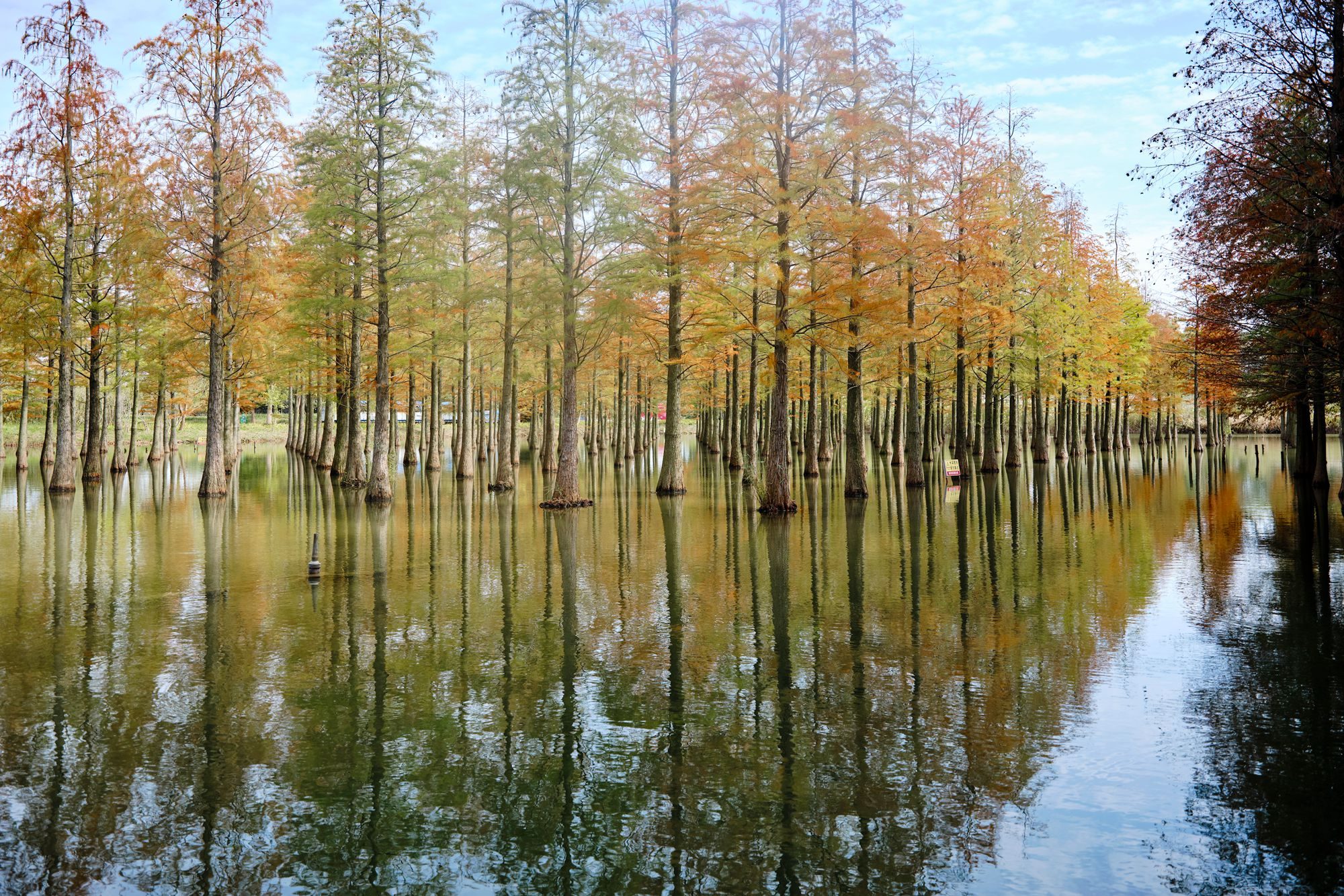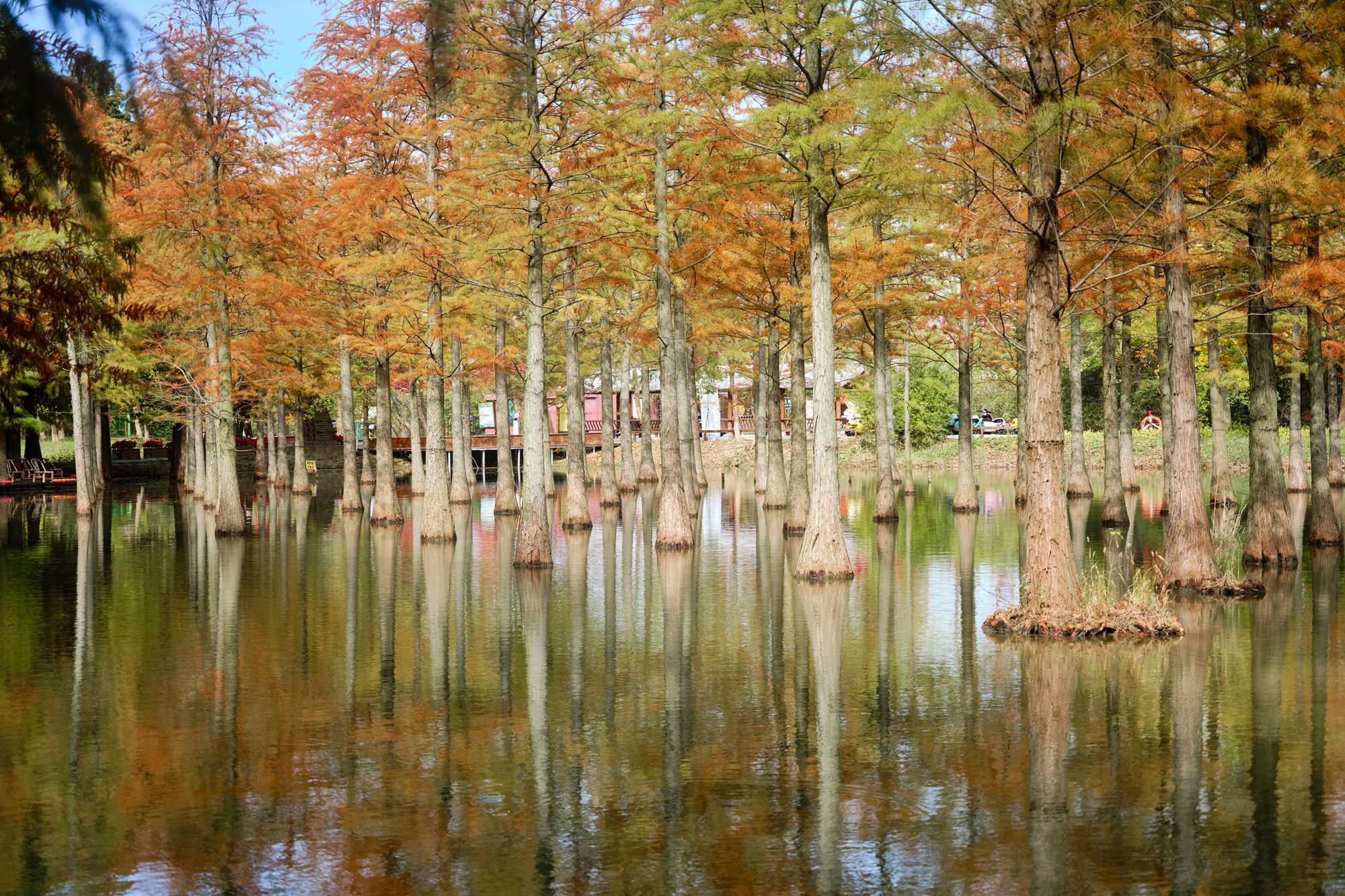 天高云淡,初冬的阳光将水杉挺拔的身影投映在水面上,枝枝叶叶留下斑驳光影。浅绿色、淡黄色、橙红色,不需要其他植物的点缀,水杉自己的色彩就已经美得耀眼夺目。
