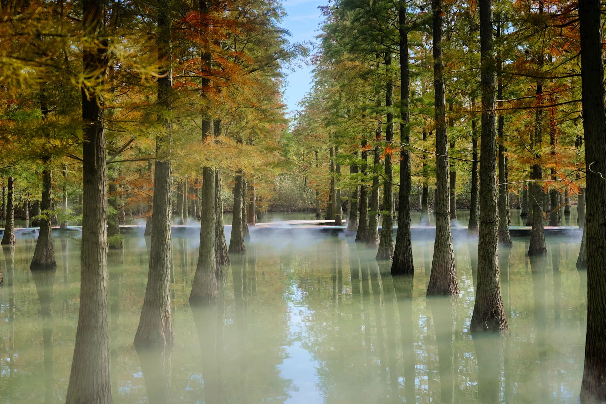 划着竹排深入,水杉林犹如打翻的调色盘,大有“乱花见入迷人眼”之势。笔直的树干与波澜不惊的湖面相映成趣,一树一木都展现着秋天独特的美丽。