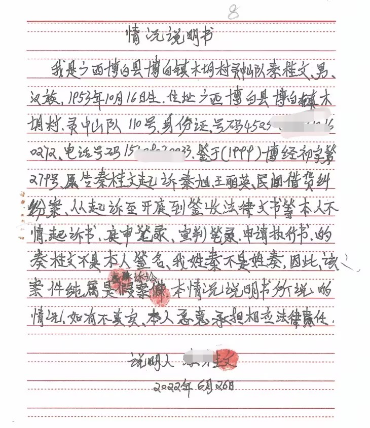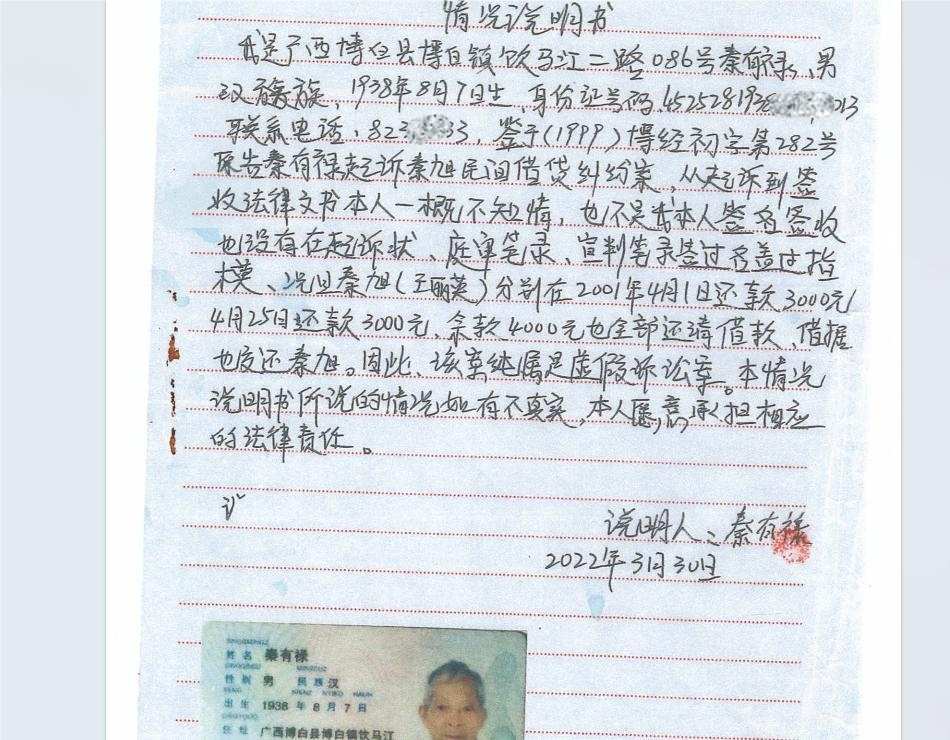 “连自己的姓氏都能被写错,这样的法律文书如何让人信服?”举报人秦旭手持泛黄的案卷材料,指向其中最扎眼的漏洞。案件源于1999年博白县人民法院审理的“(1999)博经初字第279号”民间借贷纠纷案,案卷显示原告为秦桂文,系秦旭亲属。但秦桂文出具的书面情况说明明确表示,该案从起诉、开庭到签收法律文书的全过程,均非其本人操作,所有签名均系伪造。