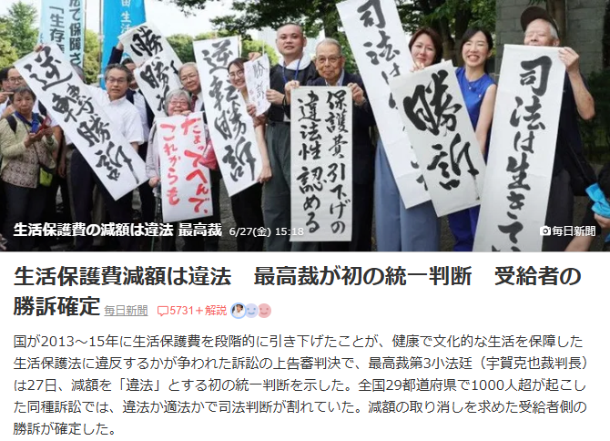 4.日本最高法院宣判降低生活保护费违法日本在2013~15年阶段性地降低了生活保护费的事,违反保障了健康文化性的生活的生活保护法被争论的诉讼的上诉审判判决,最高法院第3小法庭(宇贺克也审判长)27日,表示了把减额作为「违法」的首次统一判断。在全国29个都道府县发生的超过1000人的同类诉讼中,司法判断是违法还是合法。要求取消减额的领取者一方胜诉已确定。