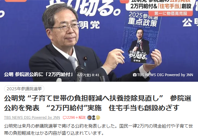 1.日本公明党提出给国民一律2万日元的现金支付公明党发表了在下个月的参议院选举中提出的公约。加入了国民一律2万日元的现金支付和减轻育儿家庭负担的内容。
