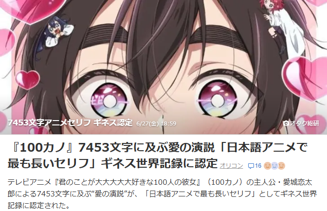 5.电视动画《最喜欢你的100个女朋友》主人公超长台词认定吉尼斯世界记录电视动画《最喜欢你的100个女朋友》(100女友)的主人公爱城恋太郎的长达7453个字的“爱的演讲”被吉尼斯世界纪录认定为“日语动画中最长的台词”。