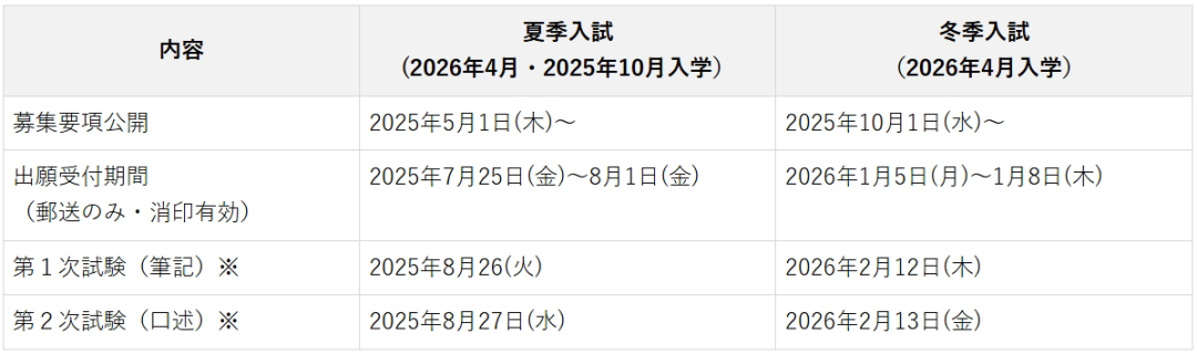 夏季入试2025年10月&2026年4月入学出愿时间:2025年7月25日-8月1日(必着)校内考时间:2025年8月26日·27日