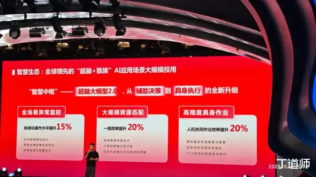 该模型在三大场景发力,全场景异常监控方面,凭借实时智能感知、物流全景监控和异常预警技术,使标准化操作水平提升15%。大规模资源匹配上,通过高效智能调配、大模型任务分配及自主作业策略,一线效率提升20%。高精度具身作业领域,基于复杂环境建模、动态目标识别和VLA任务规划,人机协同作业效率提升20%。