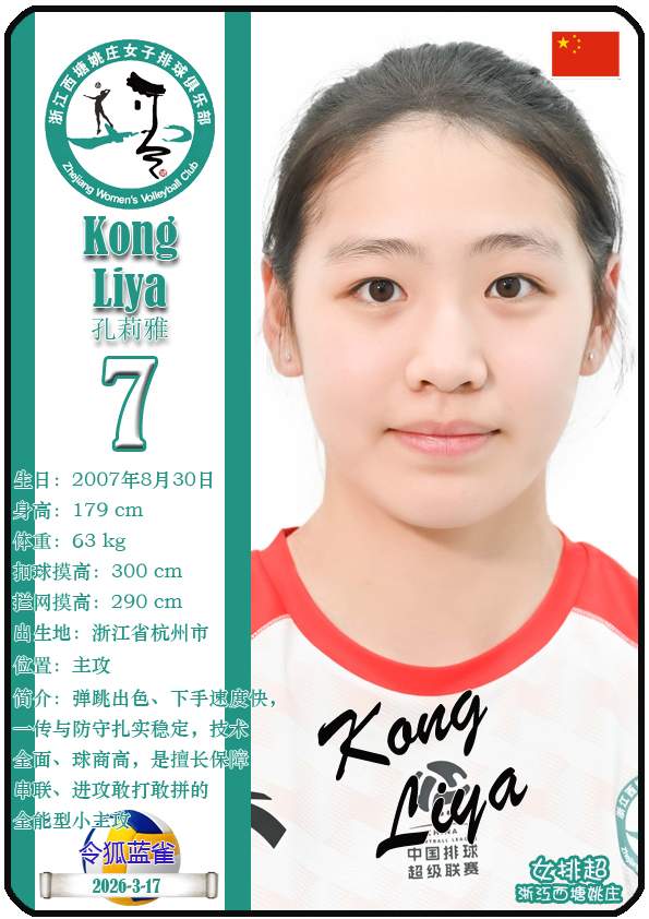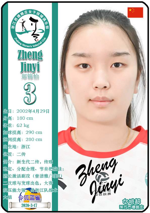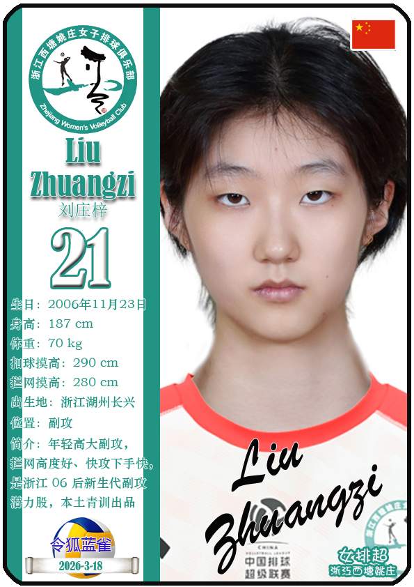 浙江西塘姚庄女子排球俱乐部成立于2024年1月,距今已有2年历史。目前球队主教练是王贺兵,队内拥有球员曾洁雅、于师羽、郑锦怡等,本期盘点截至2026年3月18日排超浙江西塘姚庄女排的25名球员(按球衣号码排序):
