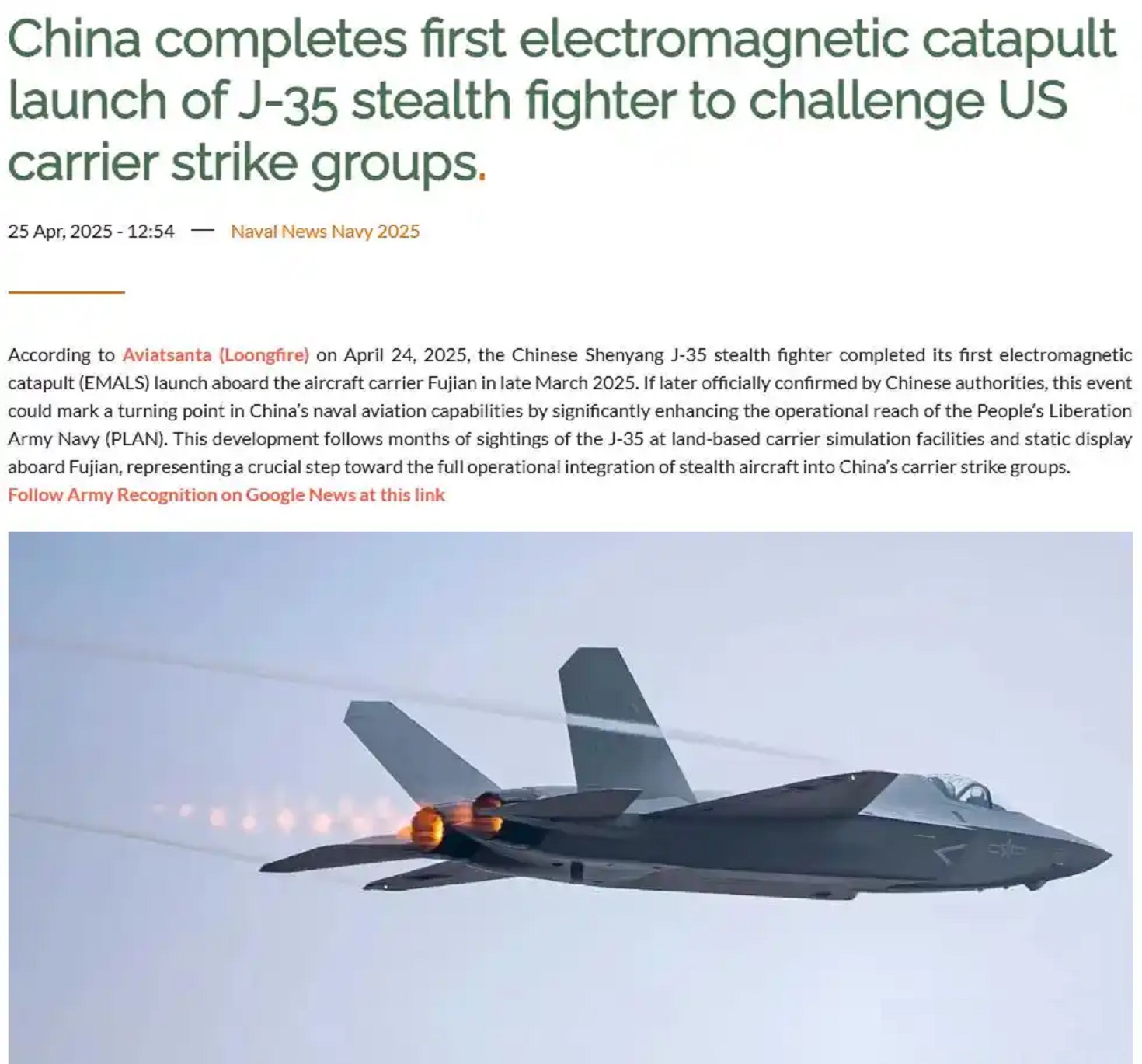 据美国航空航天开源组织“Army Recognition”网站报道,由中航工业沈阳所研制的歼-35隐身舰载战斗机,已于3月下旬在航母“福建”舰上成功完成了首次电磁弹射起飞。倘若此事得到官方证实,意味着中国海军及海军航空兵,将迈入一个全新时代。