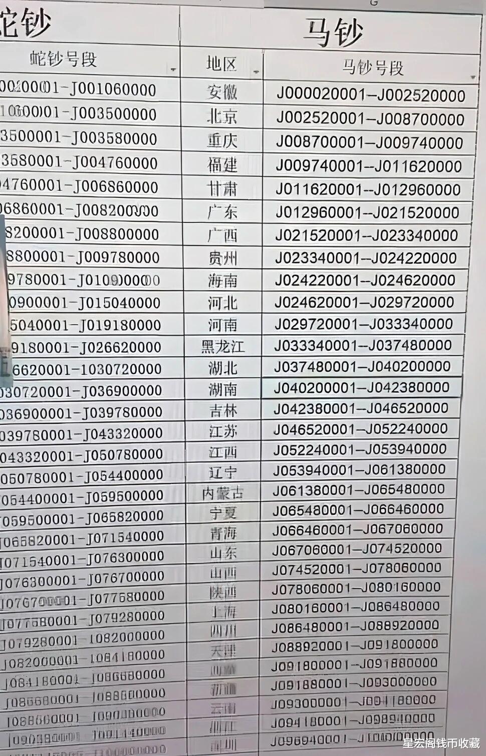 2026年马年纪念钞市场消息越来越多,最近市场上流传出了2026年马年生肖纪念钞各地区投放的号段。目前流出来2026年马年纪念钞各地区投放号段,判断真假还是比较困难。记得在2025年蛇年生肖纪念钞还没有发行的时候,市场上也出现了各种2025年蛇年纪念钞号段,结果到正式发行以后基本上对不上。