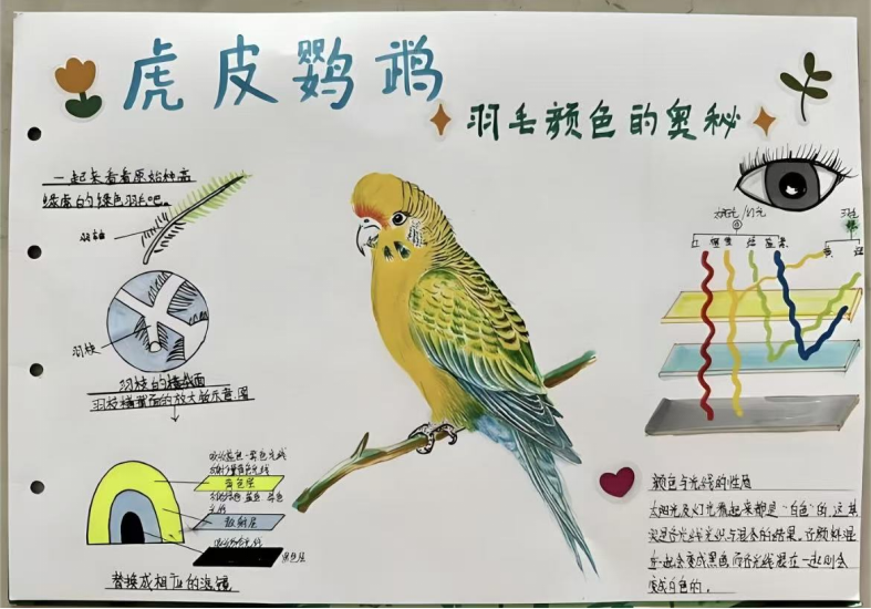 作为大学生志愿者,我带领小学生,以"虎皮鹦鹉羽毛颜色的奥秘"为主题的美育科普课。我引导孩子观察鹦鹉形态、色彩与光学原理,指导他完成手抄报绘制。孩子认真绘画、细心标注,将鹦鹉造型、羽毛结构、光色知识生动呈现,作品完整又富有童趣。这次活动让我收获了教学的快乐,更体会到美育与科普结合的意义,坚定了我陪伴孩子探索自然与艺术的初心。