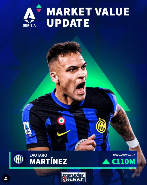 12月20日,德国转会市场网站更新了部分意甲球员的身价,其中最引人注目的是国际米兰队长劳塔罗的身价上涨至1.1亿欧元,与那不勒斯的奥斯梅恩并列成为意甲球员最高身价。