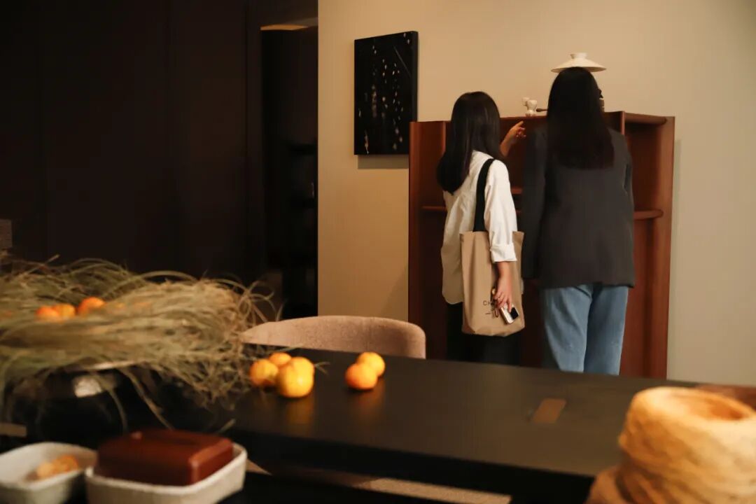 步入第二章节,空间由静转动。灯光从弧形屏风透出,引导观者继续深入,屏风的曲线源自RF Lab设计中的流动语汇。空间中的艺术发光体随着人的靠近或远离产生明暗变化,从中观者可以体会到对人际关系的隐喻。RF Lab希望人们在此重新体验联结的温度——那种不依赖屏幕、不经意间的真实相遇,因此空间不设边界,宾客可以随意落座互动区:在沙发上围坐读书,在桌前品尝一颗橘子,或和身边人一起编织手工,感受人与人微妙的共振。“心流游牧”象征城市中的游牧者:在漂泊与靠近之间寻找精神的归属,在人与人的真实互动中寻回温暖与安全。