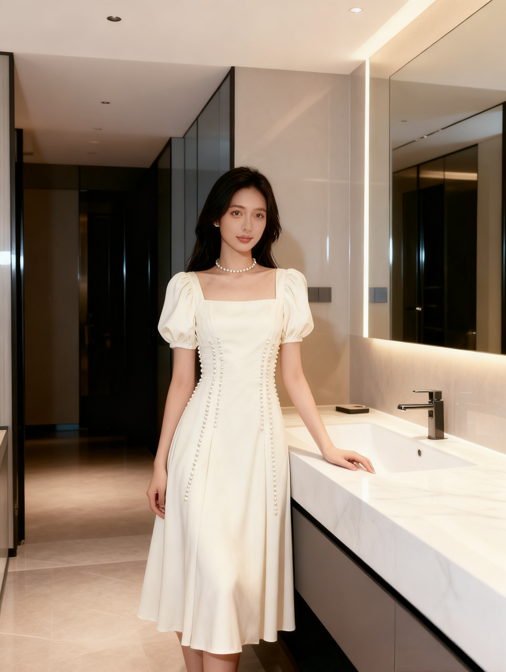 米白色长款连衣裙,裙子采用方领设计,露出精致锁骨,增添了优雅清纯感;