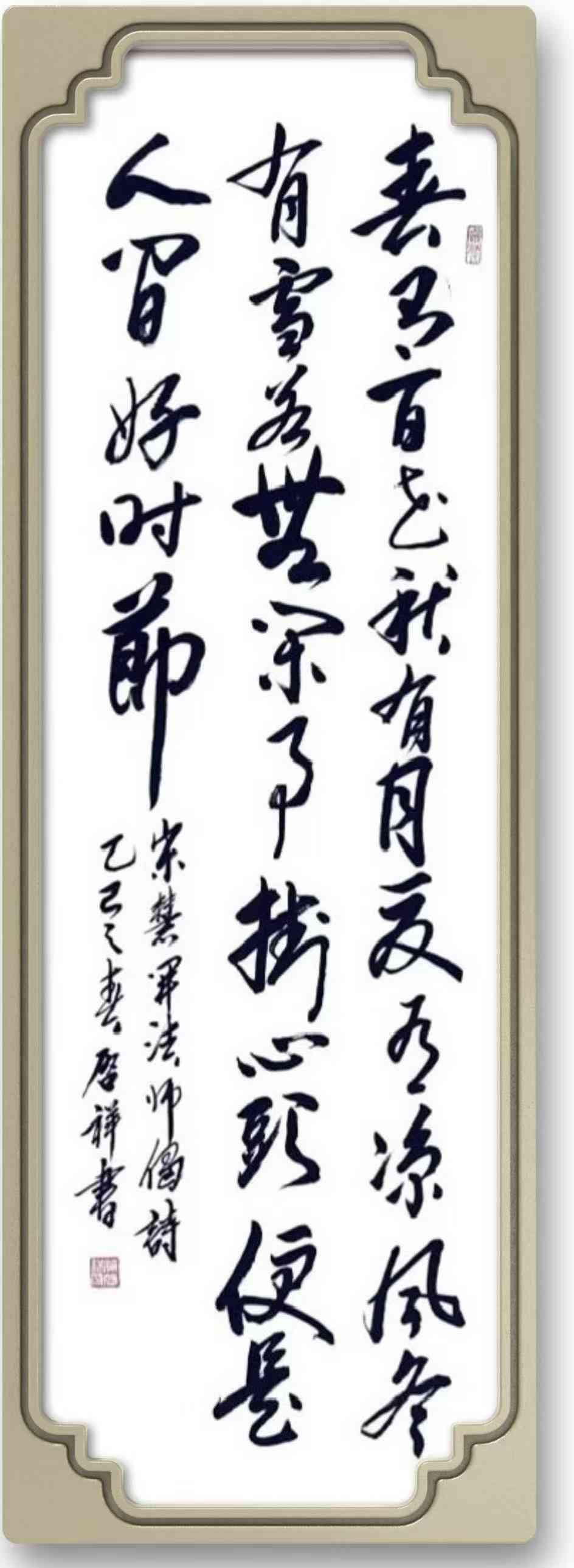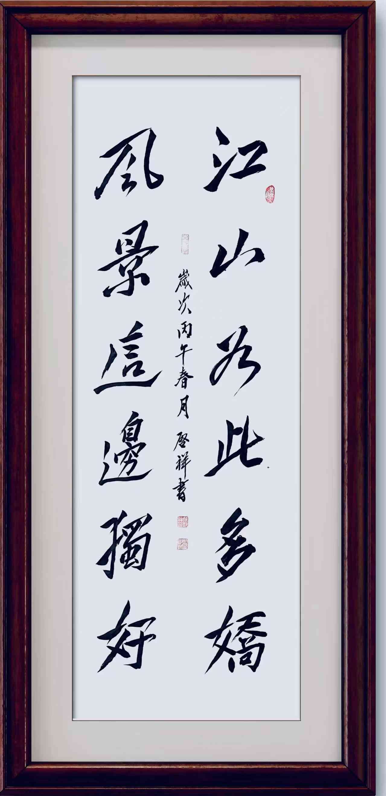 符启祥自幼酷爱书法,在中学和部队期间就积极参与墙报、黑板报的编辑出版工作,为写好软笔书法打下了坚实的基础。在职当年,中书协原副主席钟明善为他所题"《启祥如意》和《自强不息》的中堂墨宝,更增强了他学习书法的信心和动力。他退休后,重拾旧爱,参加线上书法系统培训学习,篆隶楷行草五体兼修,还积极参与有关单位庆典活动书法笔会和春节送春联下乡等实践活动。近年来,参加华夏中庭书画协会、盛唐系列第四届华夏杯、盛唐系列第三届兰亭杯、中书协兰亭杯全国慈善书画大赛,以及秦韵杯、墨缘堂、墨云翰、翰墨轩、墨韵杯等全国性书画大赛,获多项银奖、一等奖、最佳作品金奖、特等奖等荣誉。