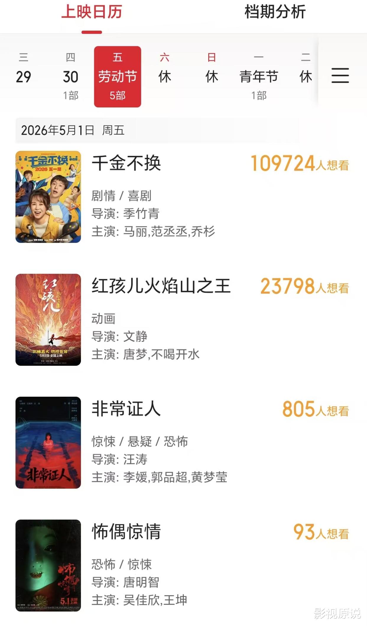 目前,就已经有六部新电影官宣定于今年的五一档上映,分别为《穿普拉达的女王2》《千金不换》《红孩儿火焰山之王》《非常证人》《怖偶惊魂》和《止罪海》。