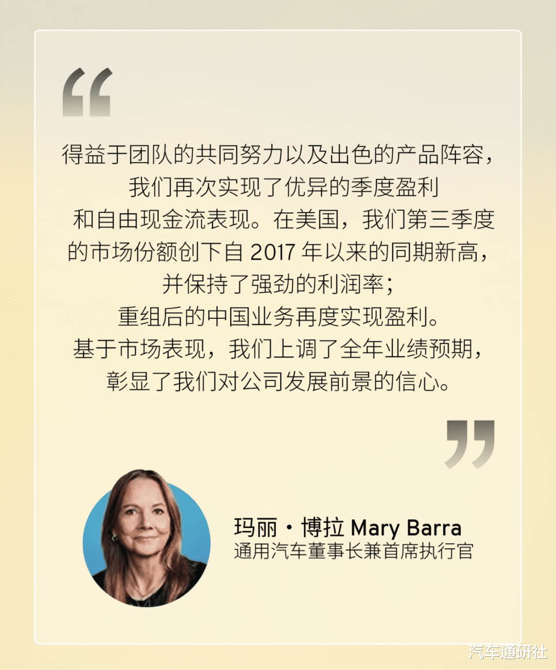 面对这份高于预期的财报,通用汽车董事长兼首席执行官玛丽·博拉不仅指出公司在美市场份额创自2017年以来同期新高的表现,更是明确对重组后的中国业务再度实现盈利表达肯定,称其为全年盈利性增长奠定基础。