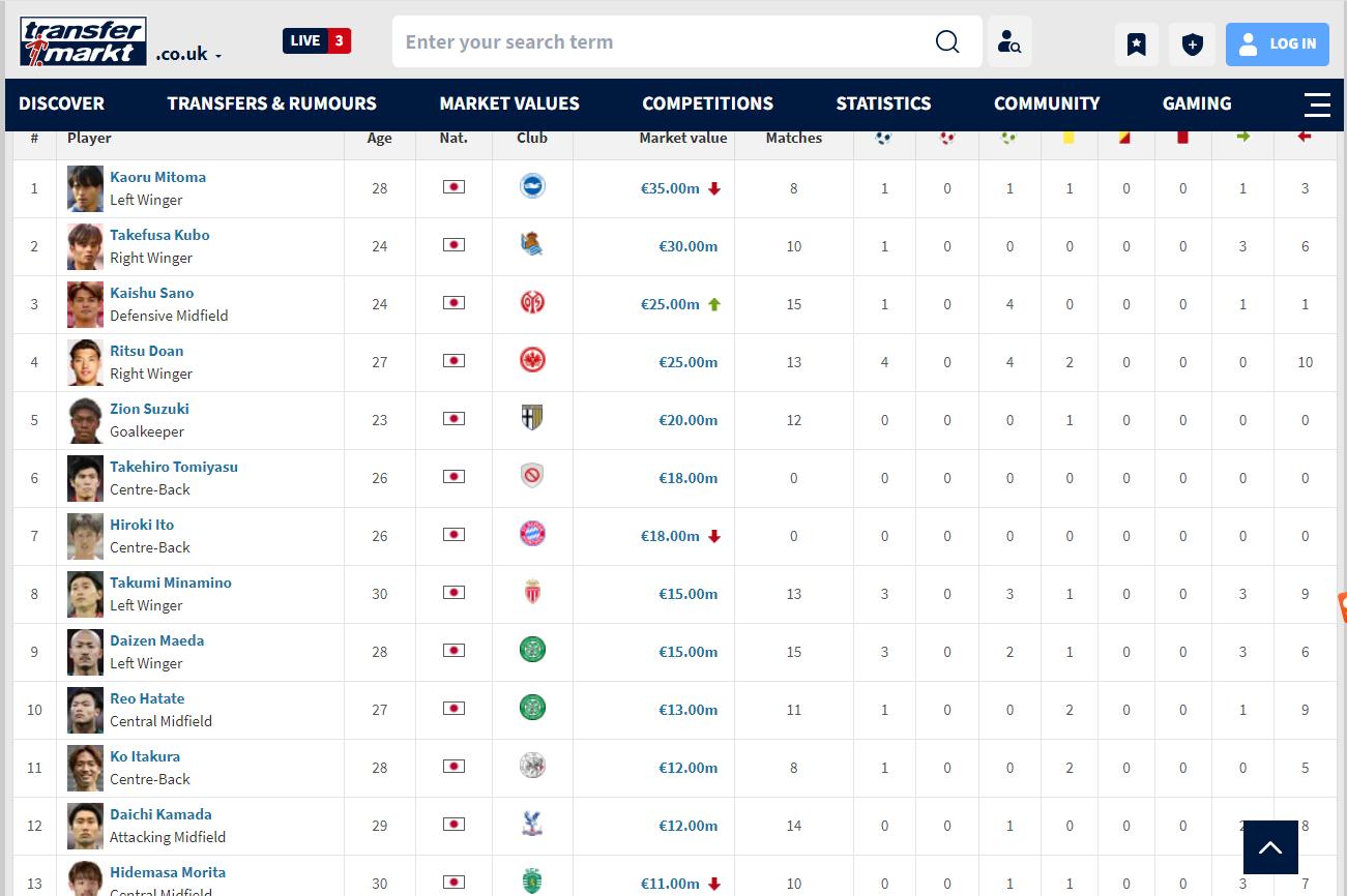 被很多球迷吹爆的三笘薰,这次首当其冲。作为目前日本队身价最高的球员,最新的德转市场对三笘薰的身价,评估为 3500 万欧元,但较上期直接下跌了500 万欧。这位在英超布莱顿效力的边锋凭借犀利突破在全球圈粉无数,如今身价下跌,也证明其竞技状态出现了明显的下降。