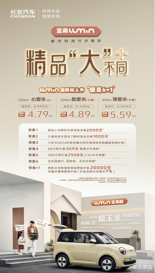 10月30日,长安新能源正式推出Lumin宝藏版,共带来心爱米、酷爱米、臻爱米三款配置,官方售价区间为4.79万至5.59万元。作为品牌又一次针对年轻用户需求的精准回应,宝藏版不仅是对外观、内饰与智能化的全面进阶,也是在安全与驾乘体验层面的系统升级。它的出现,让“精致通勤小车”有了更高的标准。