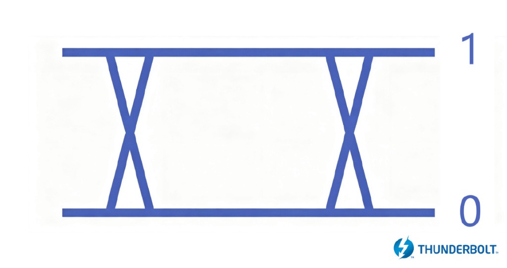 要理解PAM-3的创新之处,我们首先需要了解传统的信号技术。此前的扩展接口,包括Intel®Thunderbolt™ 4(雷电4)在内,大多采用PAM-2信号调制技术,这种技术非常简单:它只有两种信号状态——1(高电平) 和0(低电平),这与计算机中的二进制精准对应,而每个时钟周期(频率,即Hz)都只能传递1比特,也就是一个二进制符号的信息量。