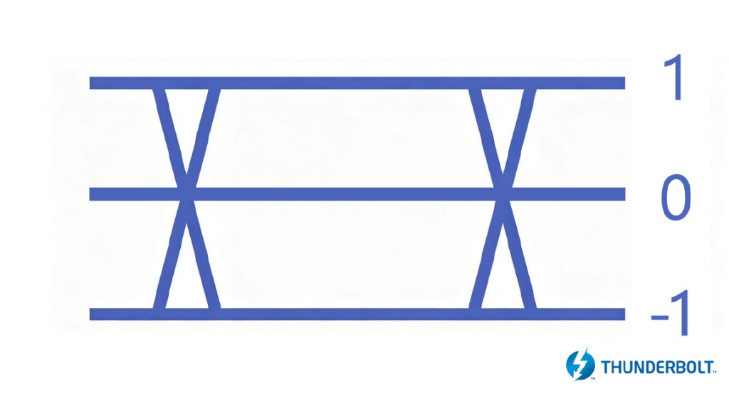所以,在Intel®Thunderbolt™ 5(雷电5)上,英特尔引入了一种新的信号调制技术——PAM-3,这种技术在1和0的基础上,增加了一个新的信号状态:-1。-1、0、1这个组合,也是早期部分计算机采用的偏置三进制数字。