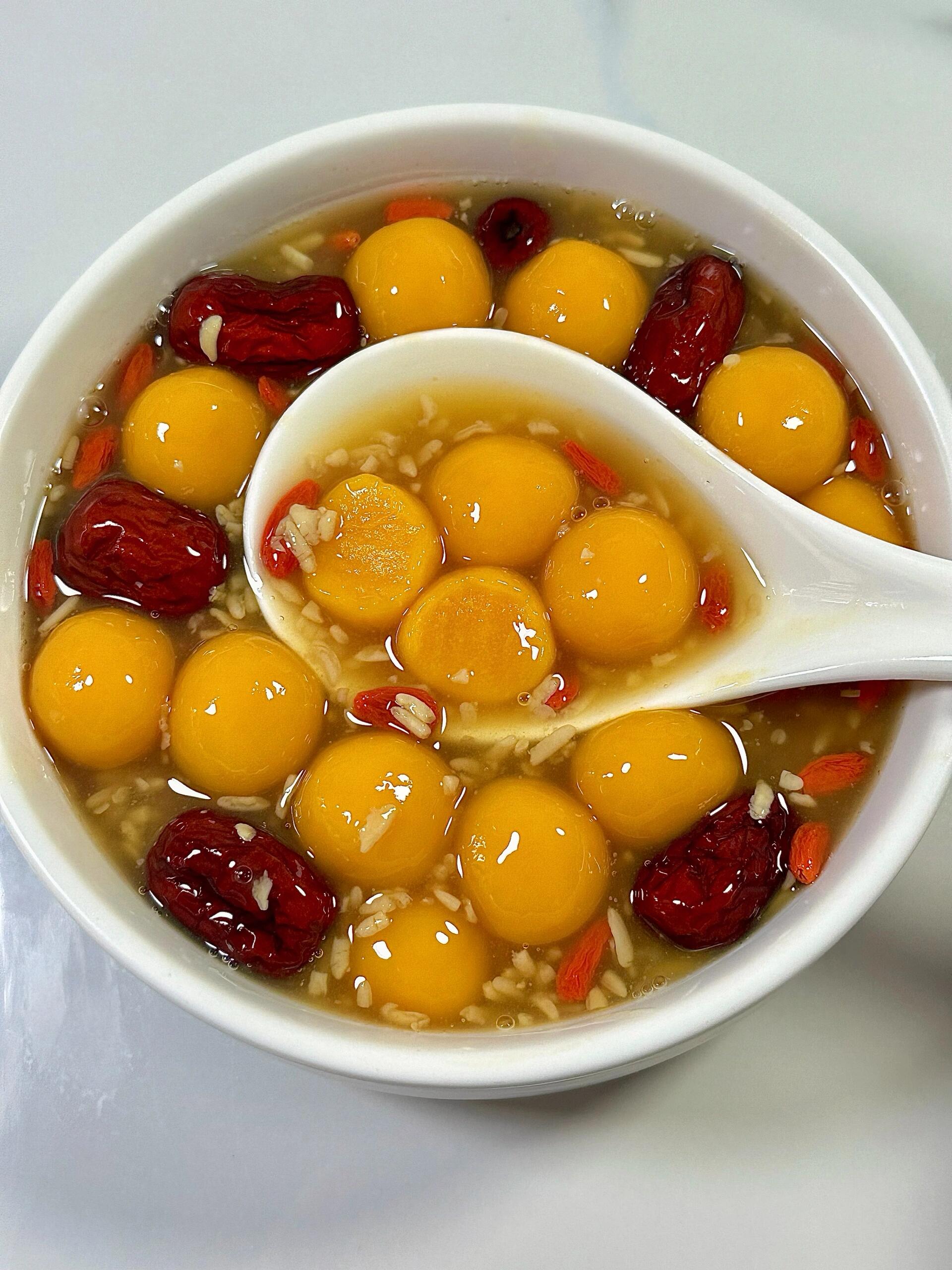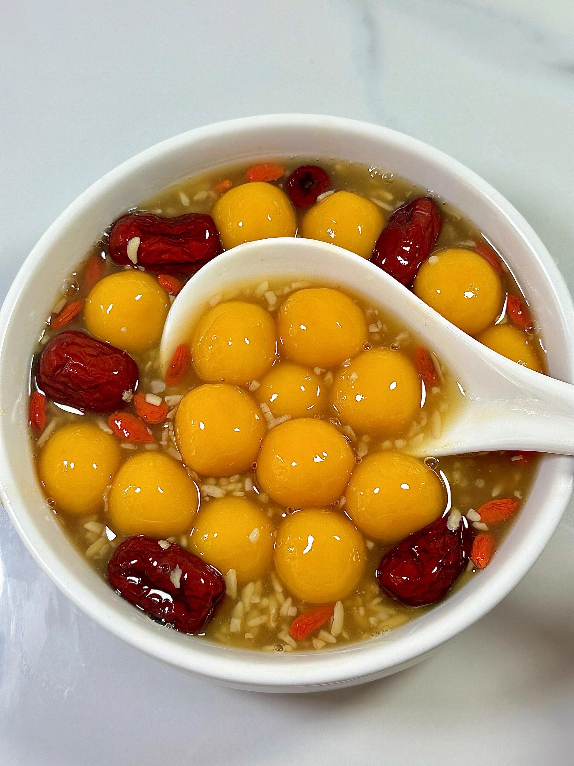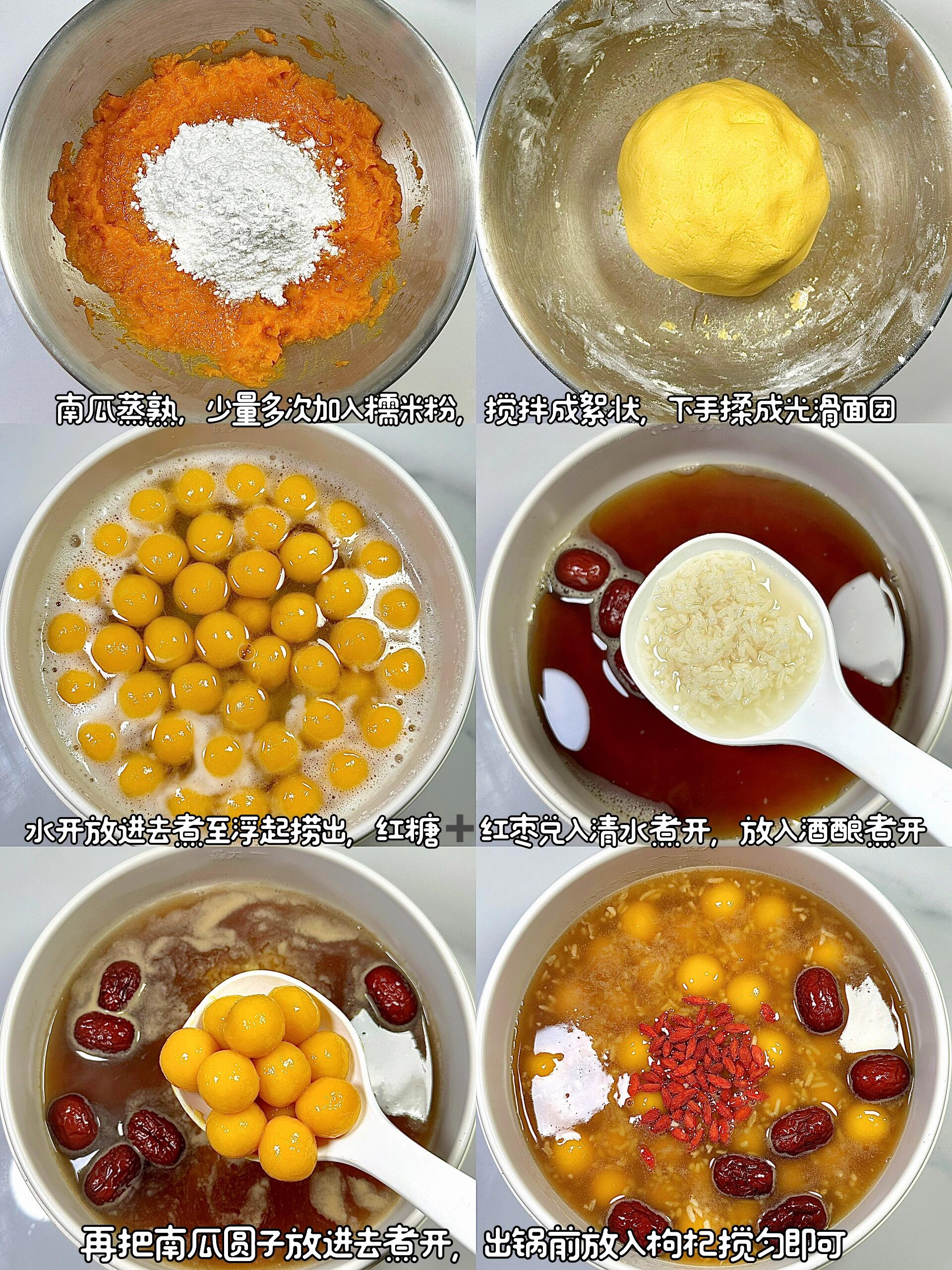 最后煮汤汁,另起一锅,倒入酒酿和适量清水(喜欢浓稠的可以少加水),放入冰糖,小火煮3分钟让冰糖融化,然后倒入煮好的南瓜丸子,再煮1分钟让丸子吸满酒酿的香味,最后撒上洗净的枸杞点缀,关火焖2分钟就好啦。