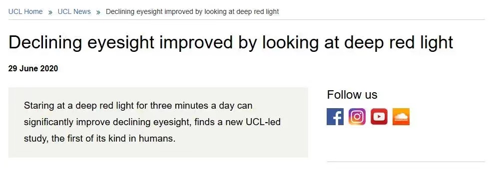 650nm到680nm之间的长波红光,叫作有益红光,它具有提高视网膜细胞线粒体、促进血液循环、促进多巴胺分泌等功效。研究发现,这种光还具有改善视力的效果。(如下图)