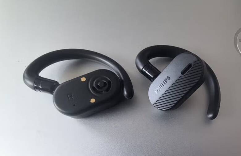 这款飞利浦 TAA6708整体设计运动风格就很足,线条硬朗但不笨重,表面用的是亲肤橡胶材质,透气性比较好,戴久了耳朵也不会发闷。单耳的重量在10.3g左右,重量方面算是中等的,短时间佩戴不会有明显的耳廓胀痛感。不过稳定性比较一般,面对跑、跳这种高频晃动的场景时,会感觉有点松。