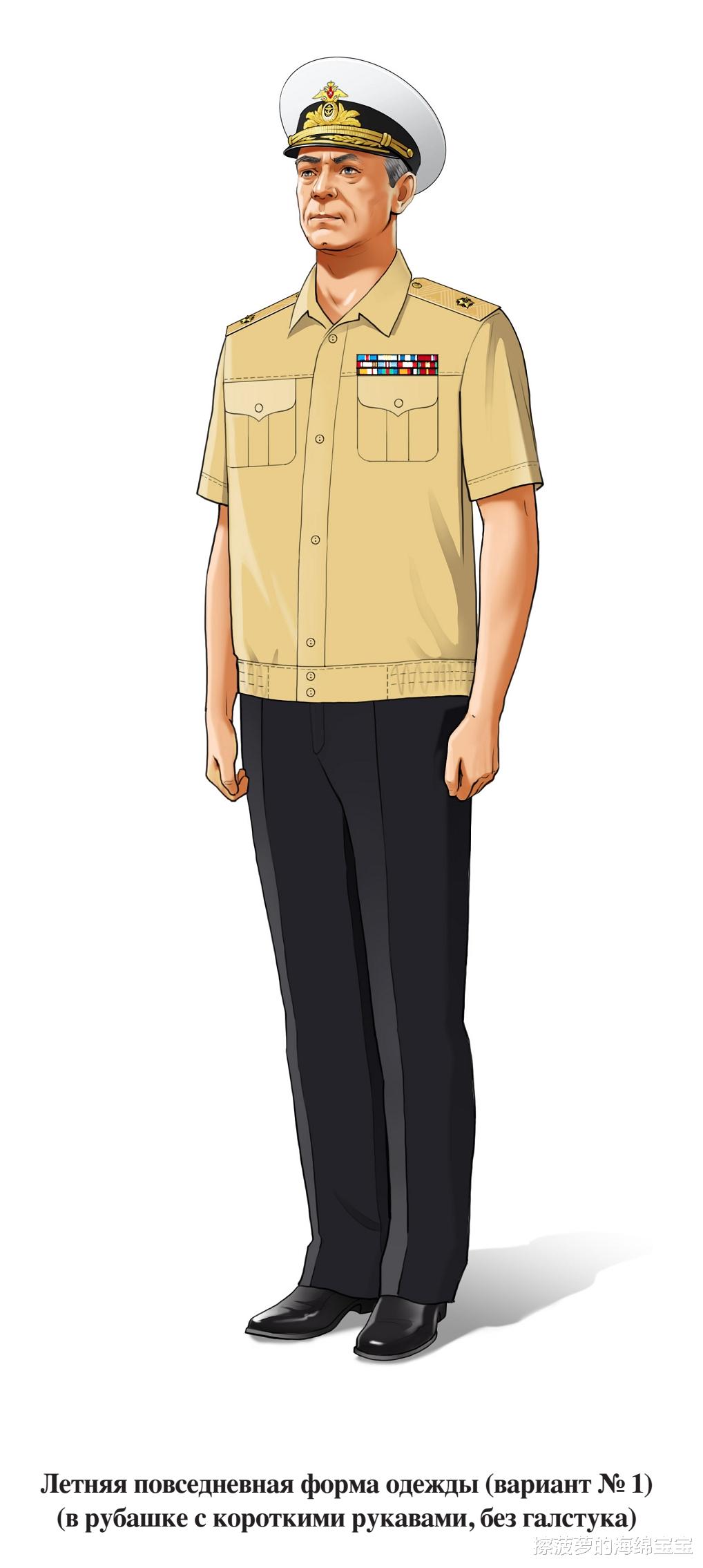 阅兵式立领礼服:海军立领礼服和陆军一样是2017年3月24日起正式启用。海军立领礼服比较复杂,按照颜色分有夏季白色和黑色两款礼服,每款礼服分为大檐帽,上衣和裤子(皮鞋跟着裤子颜色)三样。