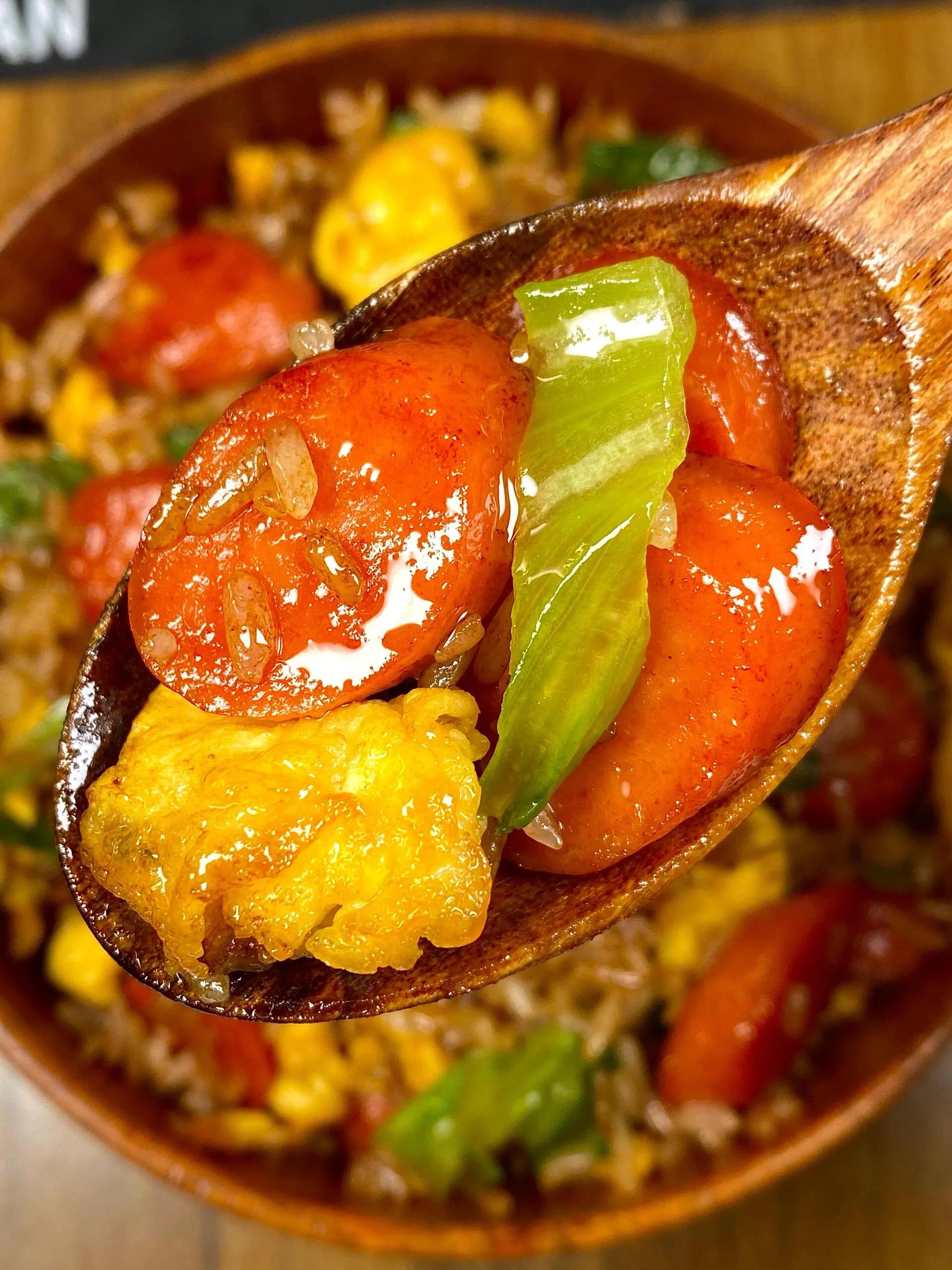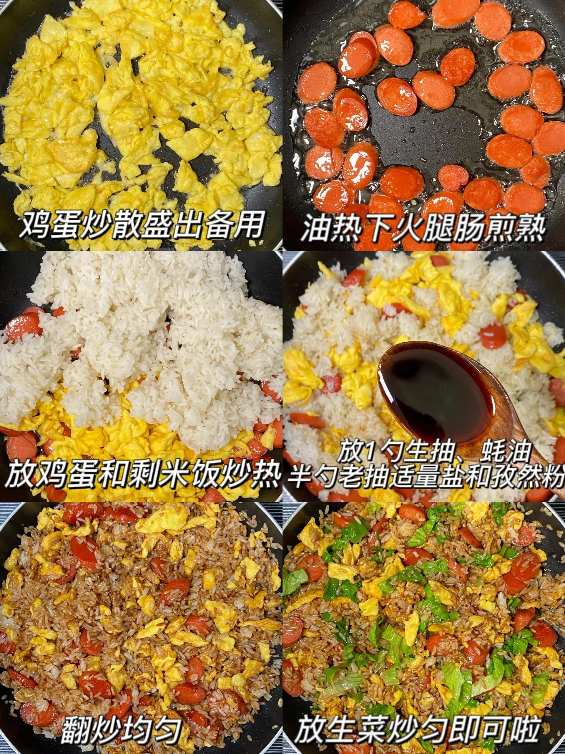 重点划重点!这几个技巧直接决定成败,新手必记:一是米饭必须选隔夜硬饭,或者新鲜饭放凉摊开吹干水分,不然容易黏成坨;二是鸡蛋加1勺清水搅匀,炒出来更蓬松嫩滑,全程大火快炒别焖;三是火腿一定要小火慢炒出焦香,逼出油脂才够味,别省这步;四是生菜最后放,大火翻炒1分钟就行,早放会变软出水,失去脆嫩口感;五是调味要“少而精”,生抽和蚝油别放多,不然米饭发黑发黏。