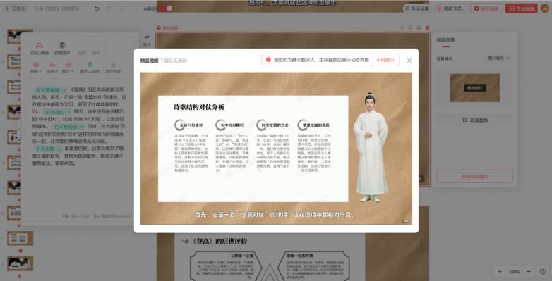 所有设置完成后,点击“生成”按钮,工具就会自动生成对应页面的口播稿和视频,全程无需手动操作。生成后大家可以逐页检查:每一页PPT对应的口播稿可以修改,比如调整表述方式、补充知识点细节;数字人的动作、表情也能按需更改;PPT的顺序、内容同样可以随时挪动、修改,灵活性极高,完全适配教师的个性化需求。