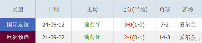 2020年以来,葡萄牙有过两次主场对爱尔兰的记录,最近一次热身赛3比0,上一次预选赛是2比1,时间不算久远,C·罗在这两场比赛中都完成了梅开二度,本场C·罗继续书写不老进球传奇的机会不低。