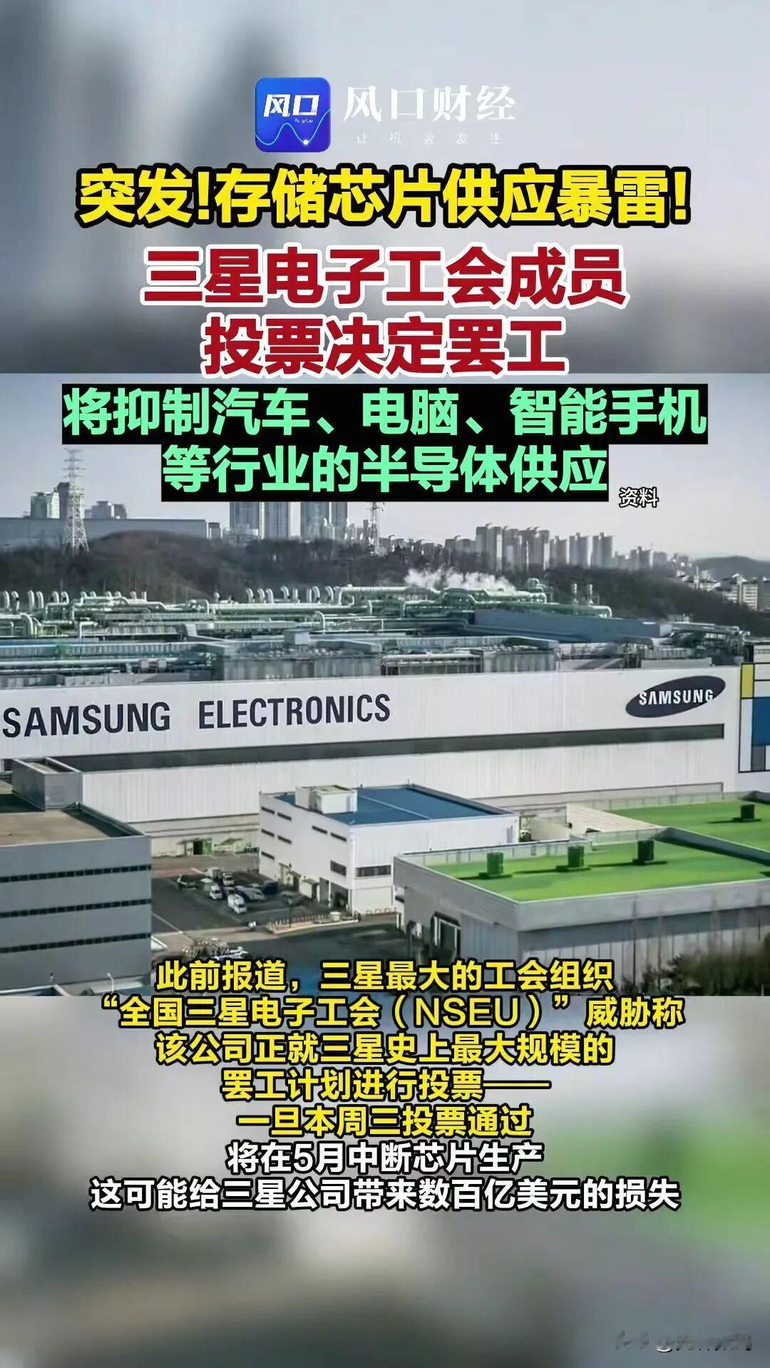 大家都知道,三星是全球存储芯片巨头,当下AI建设导致全球半导体供应趋紧,整个存储芯片价格飞涨,OPPO、vivo、荣耀等都对大部分手机进行上调价格,PC市场内存条、固态硬盘价格也是涨到离谱,三星作为存储芯片三大巨头的老大(大概占了整个行业4成的份额),真要是罢工了,那么整个存储芯片行业短缺将会彻底点燃,存储芯片短缺达到一个新高度,全球供应链都将受到重创。手机、电脑、汽车等行业都将受到影响。
