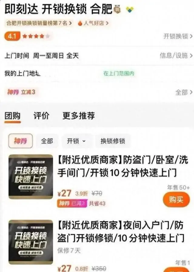 11月14日傍晚,租住在合肥市包河区的在校大学生聂女士放学回家发现钥匙落在屋内,随即在美团平台检索到本地商户“即刻达开锁换锁”。