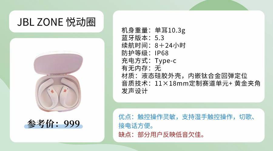 音质搭载 JBL Open Sound 定向声场技术,18×11mm 动态驱动单元配合 Adaptive Bass Boost 自适应算法,能根据音量智能调节低频力度,动感十足且层次感清晰,同时减少声音外泄。防护性能达到 IP68 级,可应对流水、沙尘等极端环境,Pulse Dry 微震排水技术更能一键排干内部水分,溯溪、划船等近水环境也能使用。