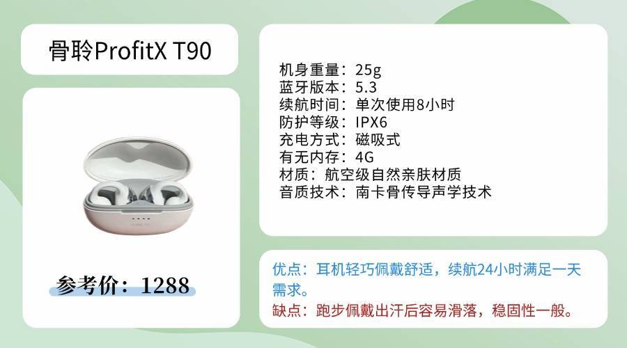 骨聆ProfitX T90采用开放式非入耳设计,单耳约7.3g的重量,佩戴轻盈无感。机身材质为亲肤硅胶,还经过纳米涂层处理,不仅触感舒适,还能增强与皮肤的贴合度——跑步、骑行等高强度运动时,耳机能保持稳固,长时间佩戴也不易产生不适,适合运动高频用户。
