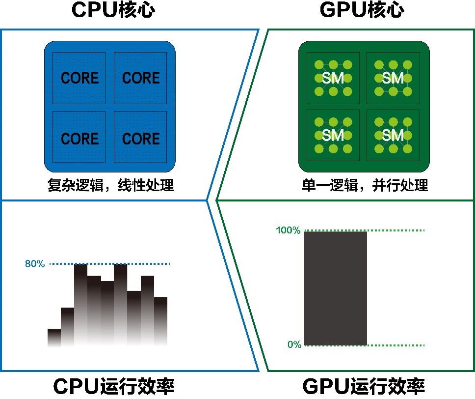 首款商用CPU面世至今已有五十五年,对于CPU,普罗大众早已熟知。AI时代最火热的GPU,除了知道其高昂的价格和强大的算力参数,其与CPU核心区别所知了了。两者虽然从名称上只有首字母的差异,但实际设计、运行方式截然不同。