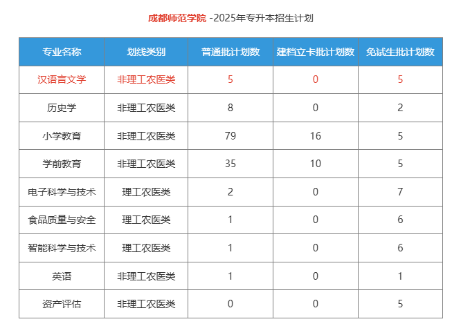 成都师范学院2025年专升本招生计划有200人,共招收9个专业招生,分别是汉语言文学、历史学、小学教育、学前教育、英语、资产评估、电子科学与技术、食品质量与安全、智能科学与技术。