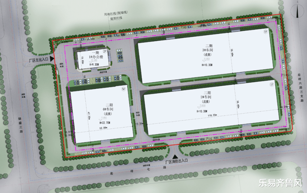 项目由青岛城乡建筑设计院有限公司设计,规划用地性质为工业用地,用地面积21611㎡,新建建筑面积21595.81㎡(全地上)。规划一期建设1栋2层办公楼,1#办公楼建筑面积908.21㎡,二期建筑包括三栋戊类车间,其中二栋一层,一栋5层,建筑面积共20687.6㎡,容积率1.51,建筑密度53.22%,绿地率11.52%,停车位93个(全地上)