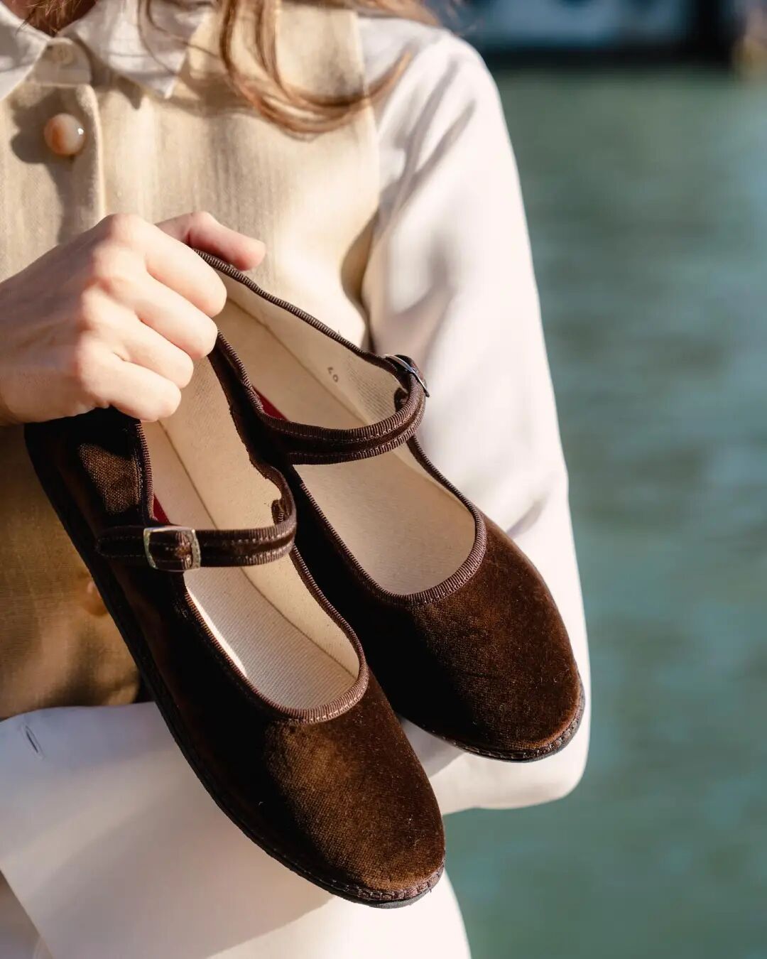 棕色丝绒鞋完全是复古感的 “隐藏王牌”,比基础黑多了份暖意,又比彩色更百搭,特别适配秋日氛围。