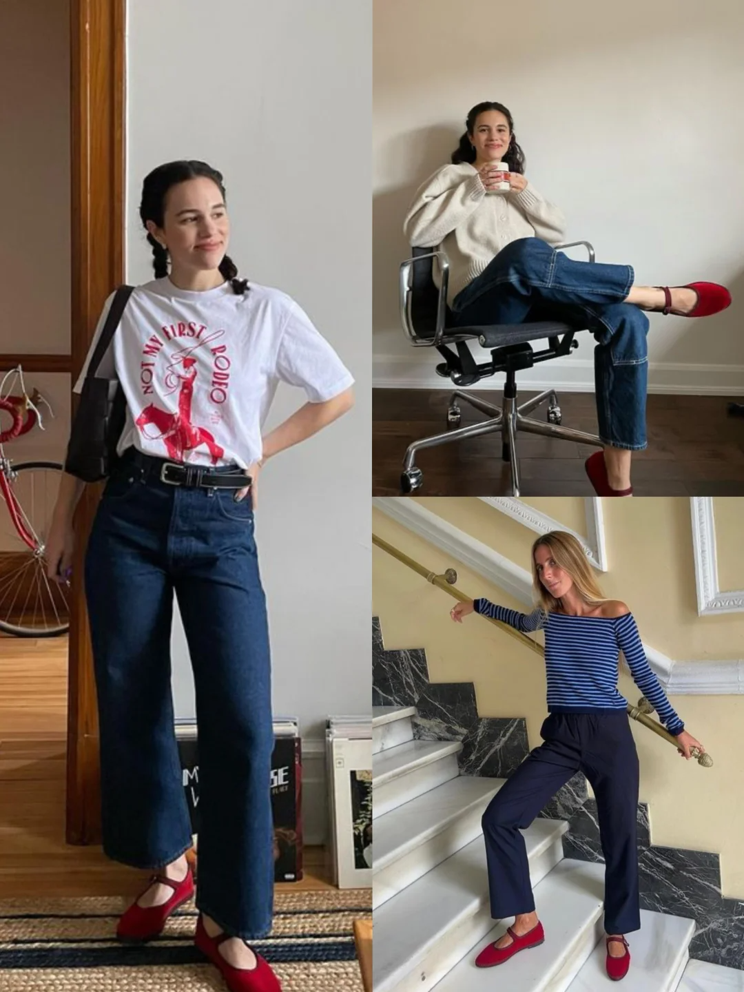 把红色丝绒玛丽珍鞋和牛仔裤、风衣搭在一起,是秋日里 “不费力赢很大” 的组合,松弛感和精致感刚好都在线。