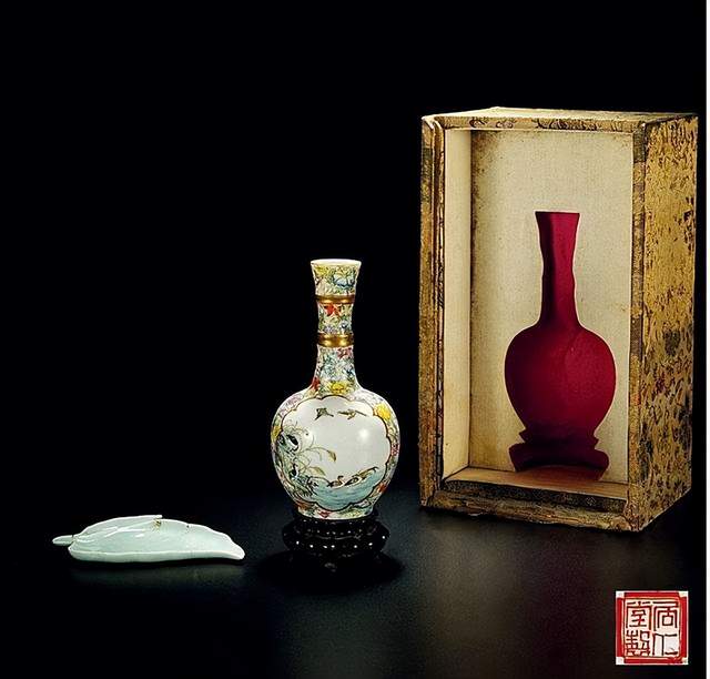 民国·常云湄旧藏居仁堂制款粉彩花卉开光长颈瓶,清豆青釉树叶形笔舔