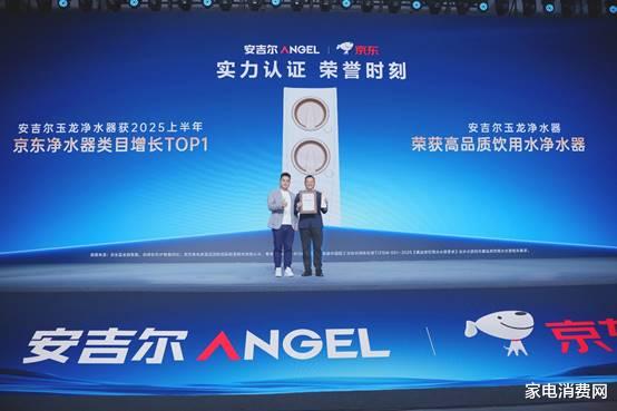 与此同时,凭借硬核的产品实力,安吉尔玉龙系列还取得2025年上半年京东净水器类目品牌系列IP同比增长第一的优异成绩,依据中国膜工业协会团体标准《高品质饮用水水质要求》(T/ZGM 001-2025),京东家电家居品质实验室联合第三方权威机构针对安吉尔净水器过滤后水质进行检测,成功通过了“高品质饮用水”检测。现场,京东家电家居生活电器业务部总经理李国祥向安吉尔集团电商事业部总经理刘志伟授予奖项,这充分肯定了安吉尔玉龙系列在线上市场中的出色表现,也激励双方在未来进一步深化合作,推动行业的高质量发展。